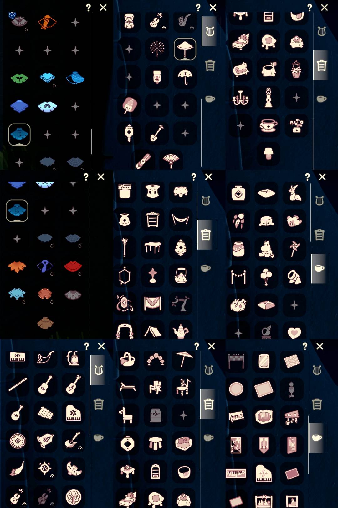 毕业季】飞行季,魔法季,潜海季,表演季,欧若拉,追忆季,彩染季 【稀有礼包】兔子拖鞋,皮皮猫礼包,彩虹耳饰,圣诞鹿角,巫树犄角,巫师帽,贝壳发饰,玉兔发饰,四叶草头饰,创始人斗篷,小王子围巾,周年线框斗篷,蝙蝠斗,蛛网斗篷,暖冬瑞雪,音韵吉他,欧若拉之声,中秋灯笼,小提琴,小憩茶桌,野餐礼包,狐狸背包,冥龙南瓜,日光耳环,姆明饰品套装,献瑞折扇礼包,大橘大利,南瓜头,年年有鱼礼包 【毕业物品】多羽发饰,蓝黄羽袖,阿拉丁帽,双边耳坠,
