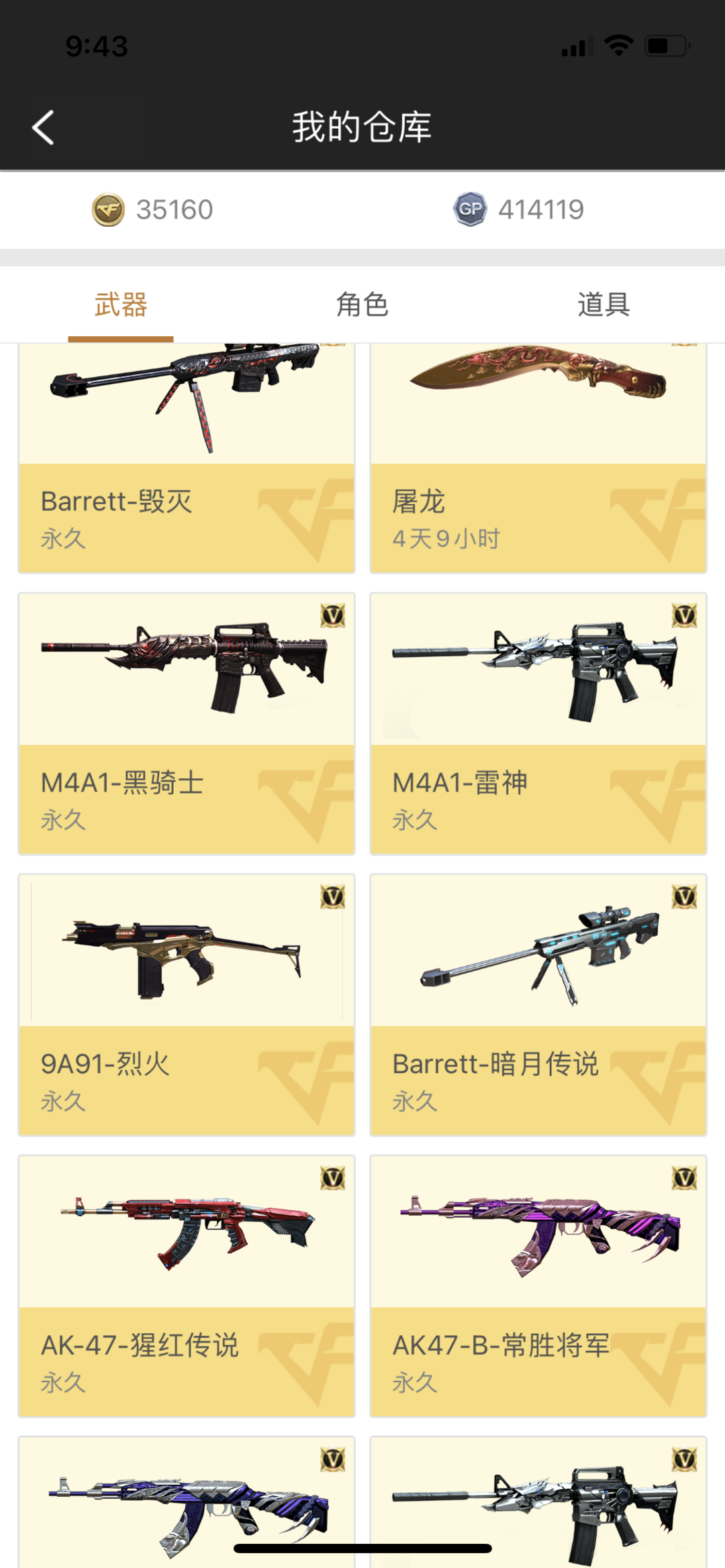 英雄武器:M4A1-雷神;沙鹰-天神;M4A1-猎神;FAMAS G2-天戎;加利尔ACE-天袭;机械迷城-穹宇;M200-幻神;屠龙;麒麟刺;AA-12-雷霆;Kar98K-星神;QBZ03-天罚;M4A1-龙血;AK47-黑鲨;M4A1-青龙;炼狱-风暴;汤姆逊-烈龙;M4A1-黑骑士;QBZ03-金色蔷薇;Barrett-毁灭;M4A1-死神;传说圣灵;天神-CF网剧冠军;黑武士-CF网剧冠军;擎天-CF网剧冠军;高爆手雷-幻灵;烟雾弹-幻灵;闪光弹-幻灵;COP 357-幻灵;Scar Light-白虎;AWM-裁决;AK12-天启;幻灵之锋;M4A1-幻灵;M4A1-玫瑰