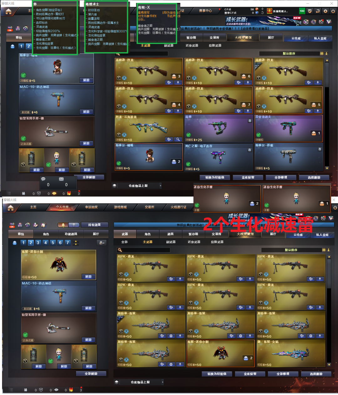 排位:可以-----------清道夫+毒蜂可以无限子弹---------生化四防全装(生化变更背包、看僵尸血量):无需换弹、6烈龙、6盘龙、斯太尔蝴蝶、异变清道夫、毒蜂、炼狱小钢、双面神、死亡之眼、MAC涂鸦、2个生化减速雷、超级对讲机、、、、、、、、、、、爆破四防:幻神(冠军之幻皮肤)、、、、、、传说破晓、USP冥王、柯尔特-无冕之王、世冠柯尔特、COP雷霆王者、传说梦魇、、、、G36幻影、白虎、QBZ金色蔷薇、、、毁灭音效、、、1套雷霆、1套幻灵、1套竞技荣光、1套神工天巧、1套云龙、1套雷霆王者、、、生化四防(毒蝰术士、隼、毒蝎)、爆破四防(传说艾莉莎、云悠悠、王者春、王者魅影、王者惊若翩鸿)