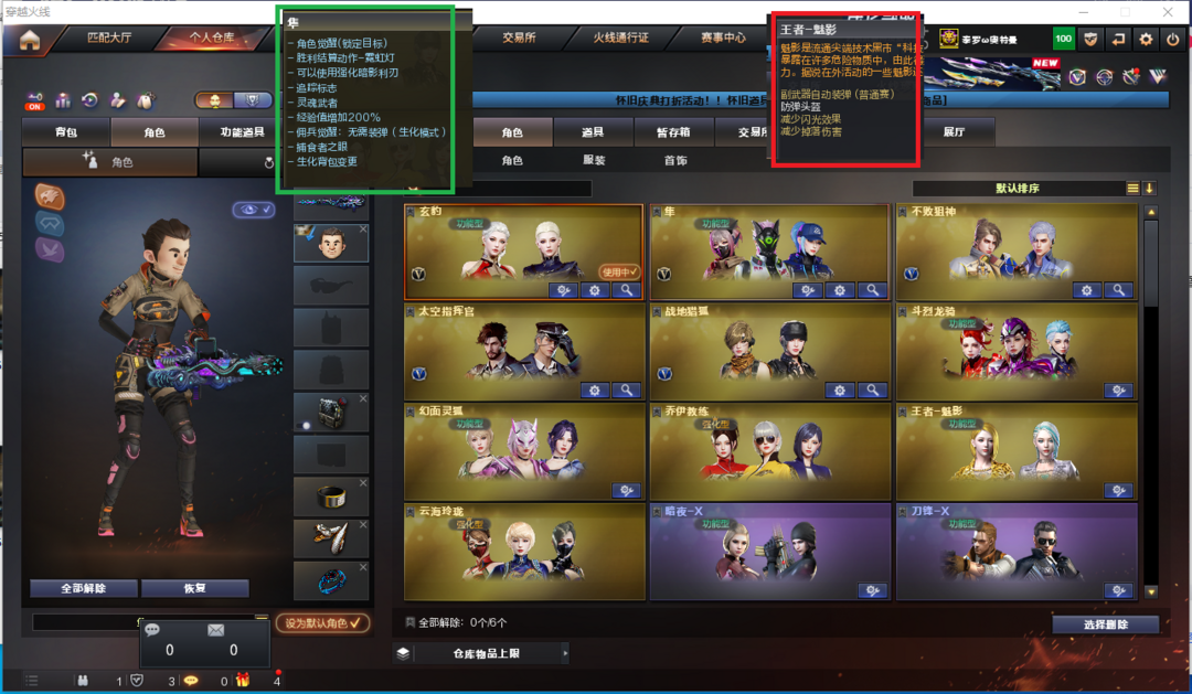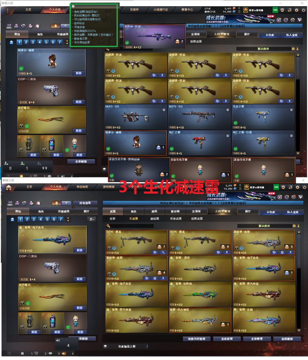 排位:可以、、、、、、、、、、、、生化全装(可以变更背包、查看僵尸血量)无需换弹、6烈龙、2盘龙、2炼狱、斯太尔蝴蝶、双面神、死亡之眼、MAC手枪、炽芒蝶刃、3个生化减速雷、超级对讲机、全部弹匣、、、、、、、、、、、爆破四防:幻神(电流骇客皮肤)、USP手枪、柯尔特手枪、QBZ冠军蔷薇、、、毁灭音效、火麒麟音效、、、1套雷暴、1套幻灵、1套竞技荣光、1套玄豹、、、生化人物(隼)爆破四防(玄豹、王者魅影)