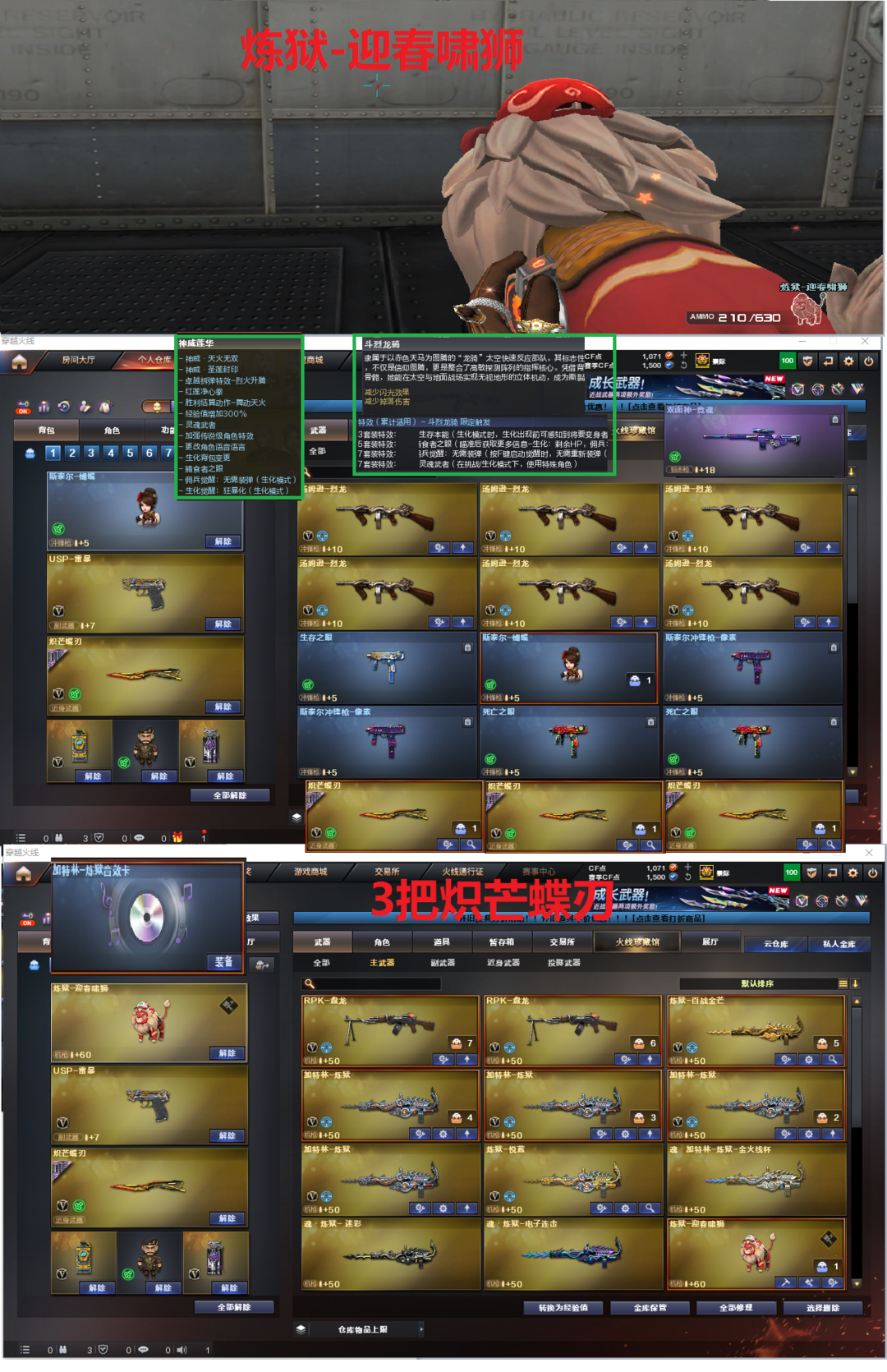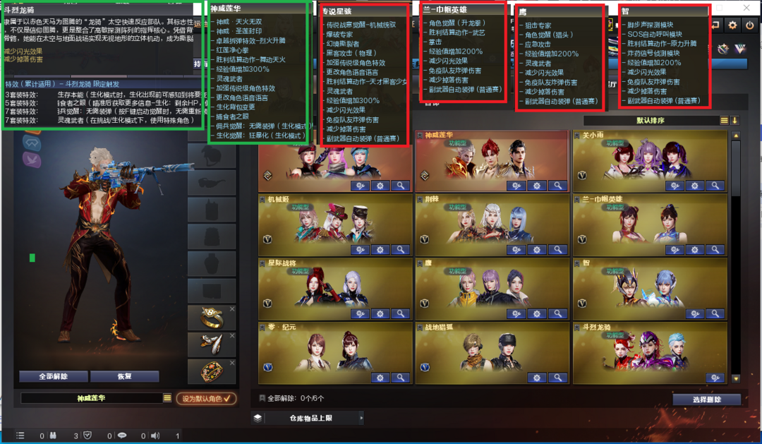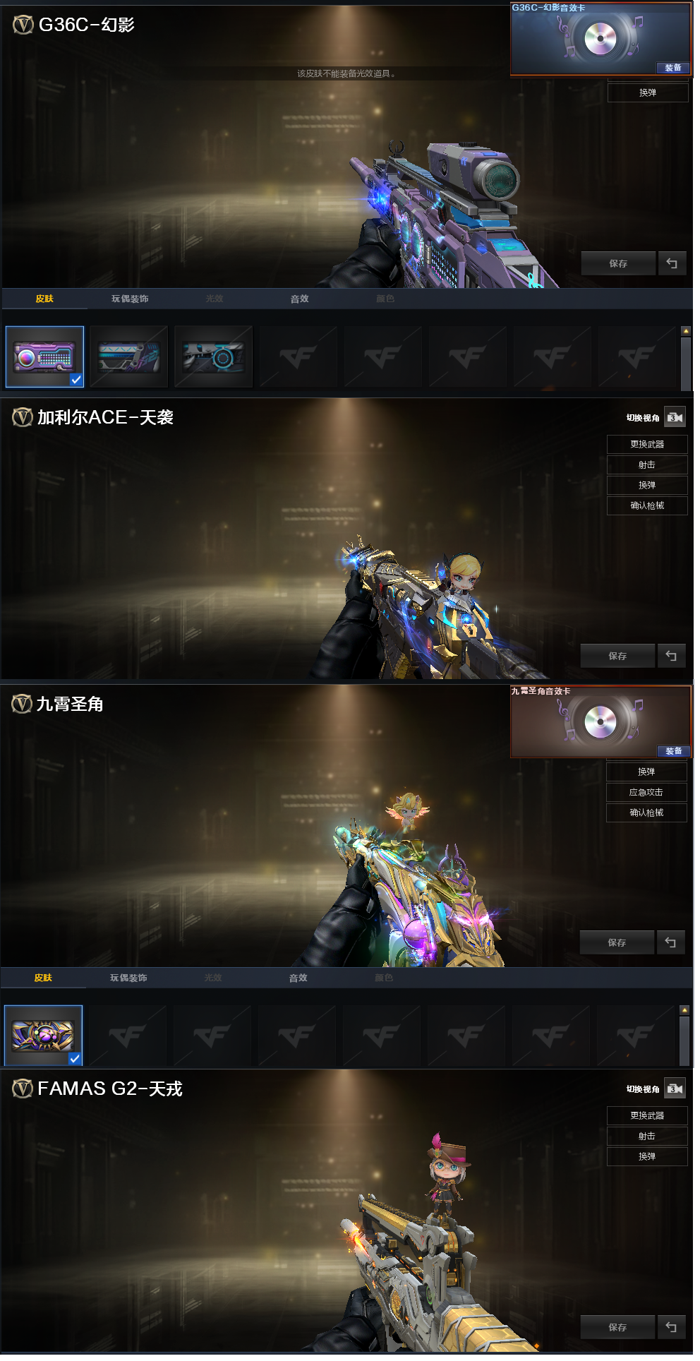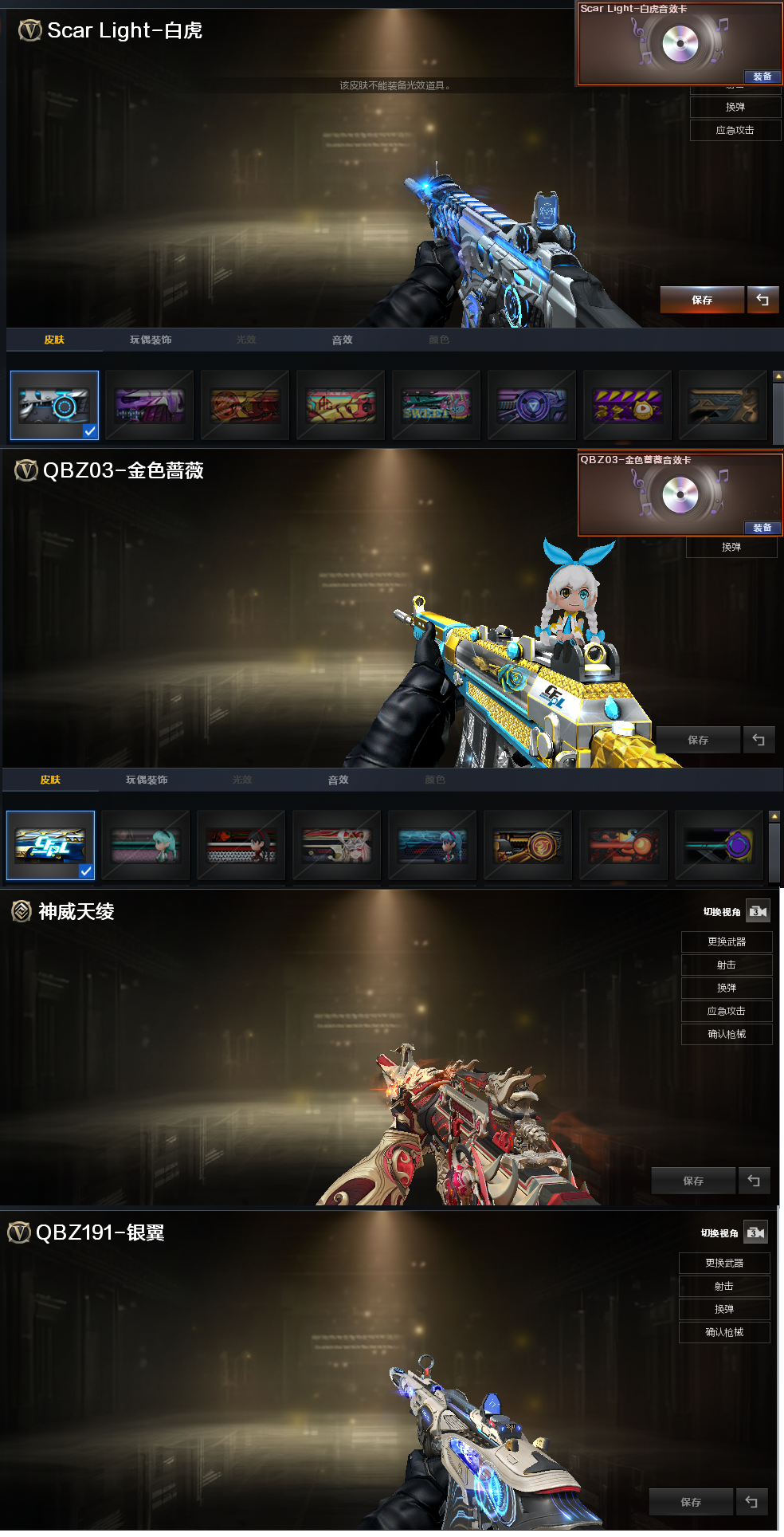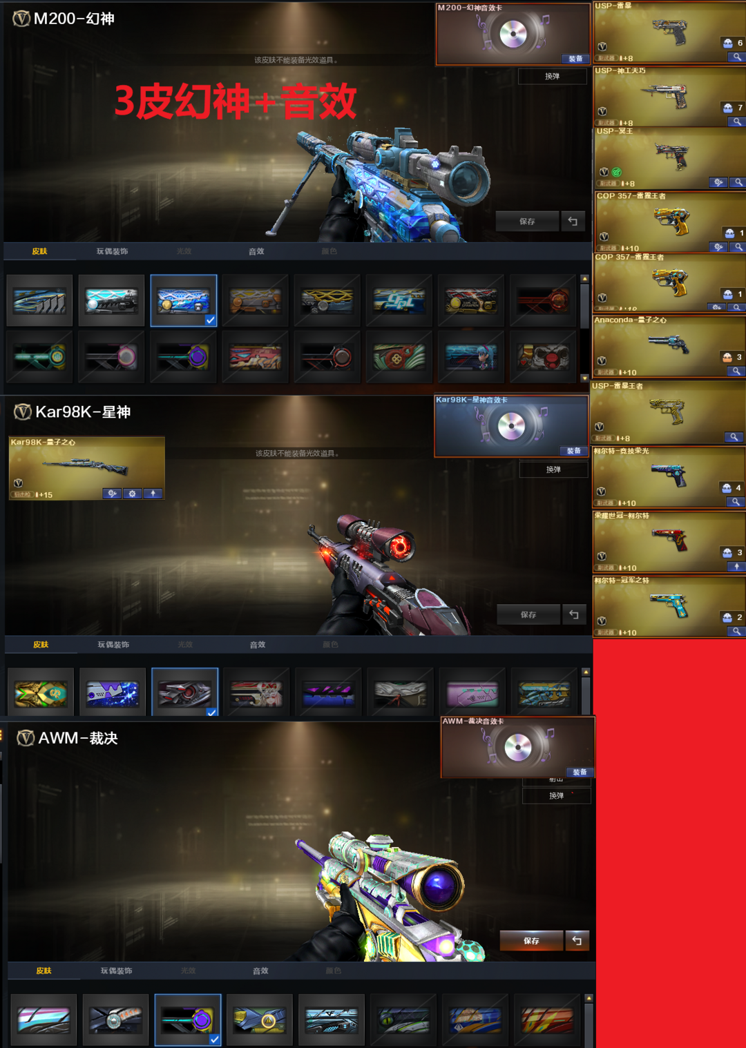 白鲨、电流骇客皮肤)、98K星神、98K-量子之心、USP雷暴、USP神工天巧、USP冥王、柯尔特竞技荣光、世冠柯尔特、2个COP王者堕天神、USP雷暴王者、冠军之特、神威天绫、G36幻影、加利尔ACE-天袭、FAMAS G2-天戎、QBZ191-银翼、九霄圣角、传说光耀、白虎、QBZ冠军蔷薇、、、幻神音效、裁决音效、幻影音效、九霄圣角音效、蔷薇音效、白虎音效、星神音效、毁灭音效、雷神音效、极光音效、黑龙音效、炼狱音效、火麒麟音效、、、4套雷暴、1套幻灵、1套竞技荣光、2套神工天巧、2套量子之心、1套雷霆王者、1套雷暴王者、、、生化四防(神威莲华、斗烈龙骑)爆破四防(传说星骇、兰-巾帼英雄、鹰、智、王者春、关小雨、机械姬、荆棘、王者刀锋、职业经理、铁扇公主-暗灵)