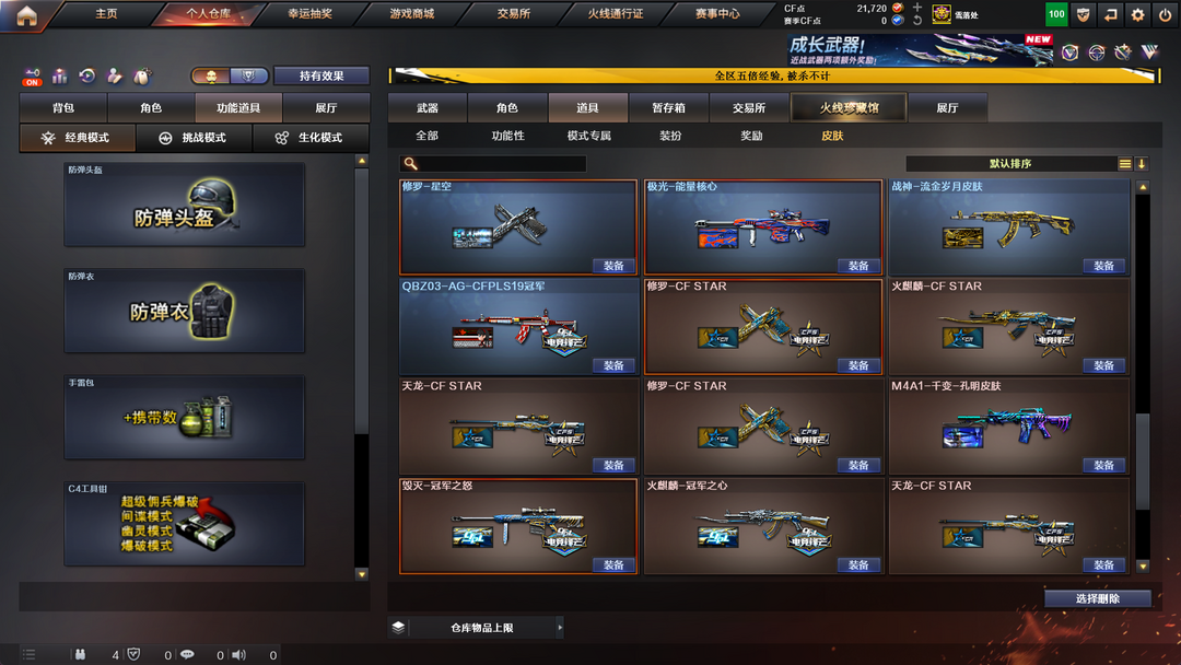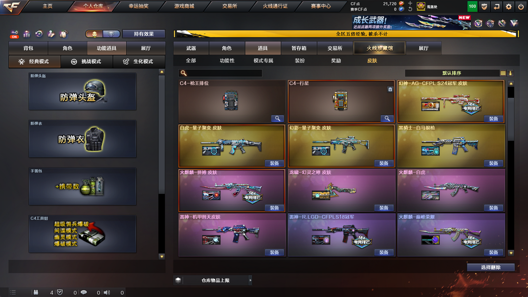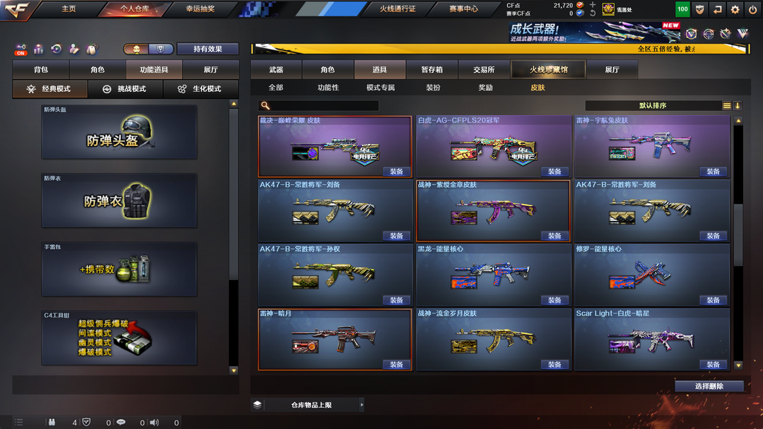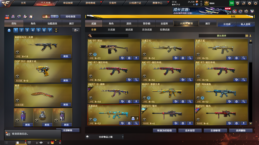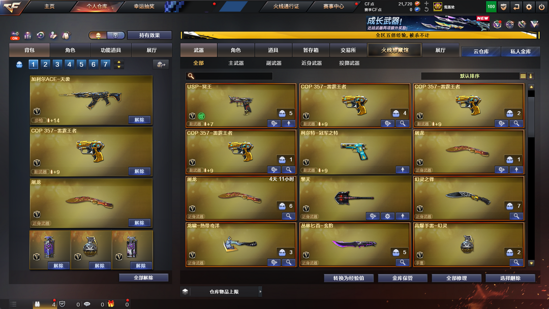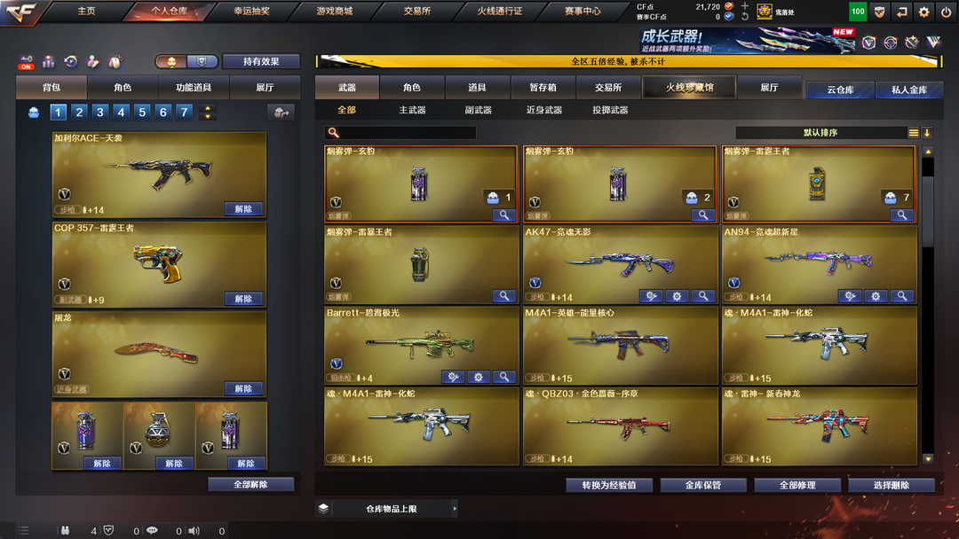英雄武器:USP-神工天巧;加利尔ACE-天袭;M4A1-猎神;AK47-火麒麟;Barrett-碧霄极光;USP-冥王;9A91-烈火;闪光弹-玄豹;丛林匕首-玄豹;烟雾弹-玄豹;AWM-裁决;机械迷城-穹宇;手雷-热带奇洋;龙啸-热带奇洋;沙鹰-天神;烟雾弹-云龙;沙鹰-修罗;黑武士-锦绣游龙;Barrett-暗月传说;AK-47-猩红传说;AK47-B-战神;白虎-电玩蓝兔;传说辉光;屠龙;烟雾弹-幻灵;QBZ03-金色蔷薇;幻灵之锋;高爆手雷-幻灵;Scar Light-白虎;闪光弹-幻灵;M200-幻神;汤姆逊-烈龙;擎天;Barrett-极光;M4A1-雷神