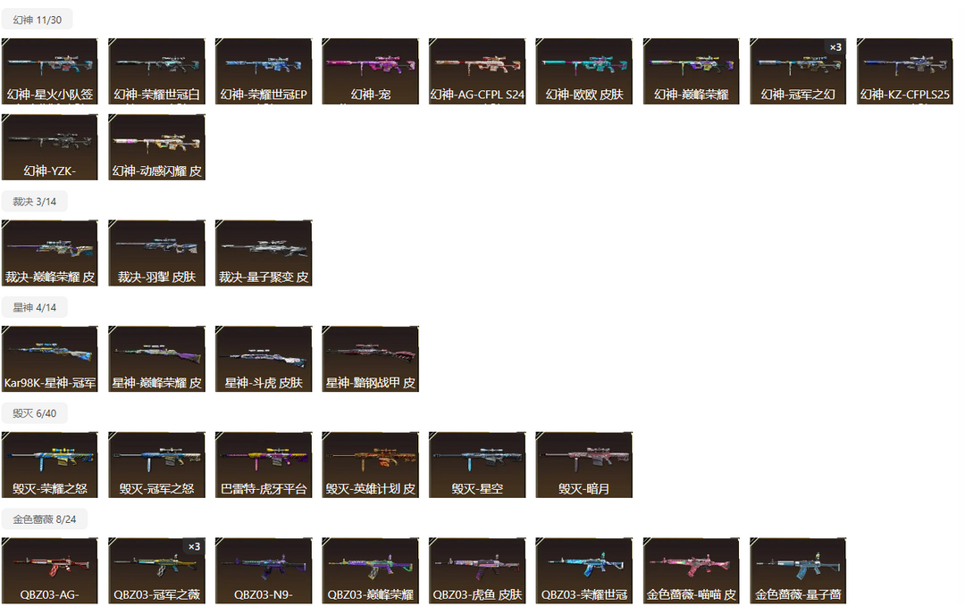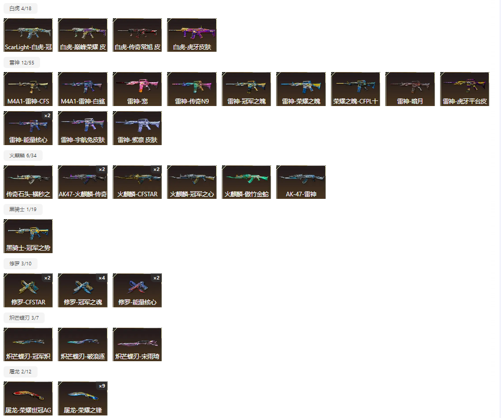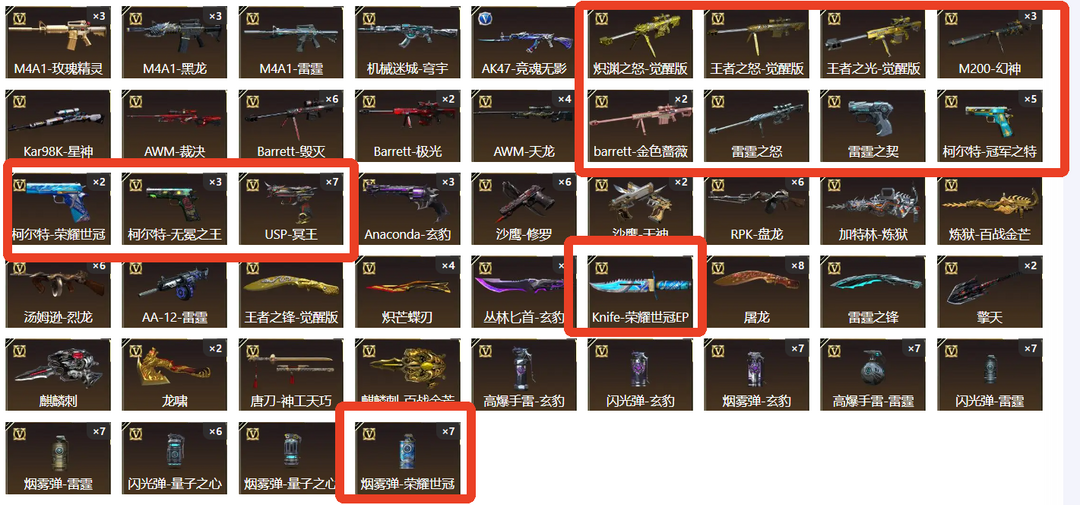 200V超核玩家,爆破生化挑战三全装, 双神威 幻神13皮yzk,星火,冠幻,欧欧,宠儿,KZ,ep,巅峰,白鲨等最新皮肤,星神三件套,裁决三件套,白虎常旭,雷神虎牙,巴雷特虎牙,白虎虎牙,星神虎牙,QBZ虎牙 N9等,双子星套装齐全,冠军套装齐全,轮椅枪齐全,10冥王10柯尔特,冠军皮肤全套。冠军之刃,EP之刃 4炽芒蝶刃 荣耀之魄珍藏十周年等等,不定时更新最新装备。开挂鼠标宏封号律师必起诉,望大哥玩的开心
