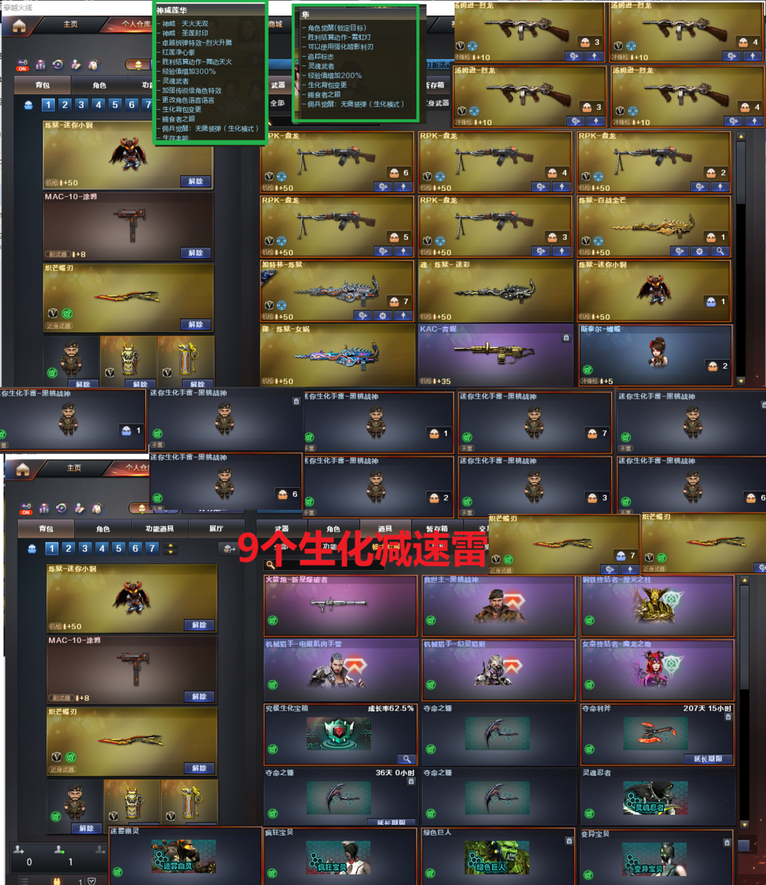排位:可以、、、、、、、、、生化四防全装(可以变更背包、查看僵尸血量)无需换弹、4烈龙、6盘、炼狱+音效、炼狱小刚、斯太尔蝴蝶、死亡之眼、MAC手枪、2把炽芒蝶刃、9个生化减速雷、超级对讲机、全部弹匣、、、、、、、、、、、、、、、、爆破四防:幻神2皮(EP荣耀、星火小队皮肤)、王者沧神、98K星神、M200竞技荣光、2个USP雷暴王者、USP冥王、柯尔特-无冕之王、COP王者堕天神、2个柯尔特EP荣耀、2个柯尔特竞技荣光、、、、、G36幻影、传说辉光、QBZ金色蔷薇、白虎、马枪、王者风神、炽芒蝶刃、、、裁决音效、幻影音效、星神音效、蔷薇音效、白虎音效、雷神音效、黑骑士音效、、、4套王者堕天神、4套雷暴王者、4套竞技荣光、、、生化四防(神威莲华、隼、嘉年华灵狐)、爆破四防(雨墨、妮妮、关小雨、星际战将、司雨、研)