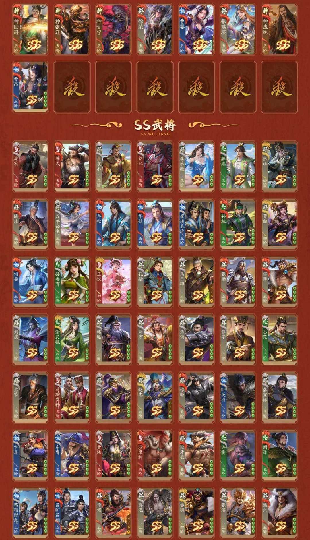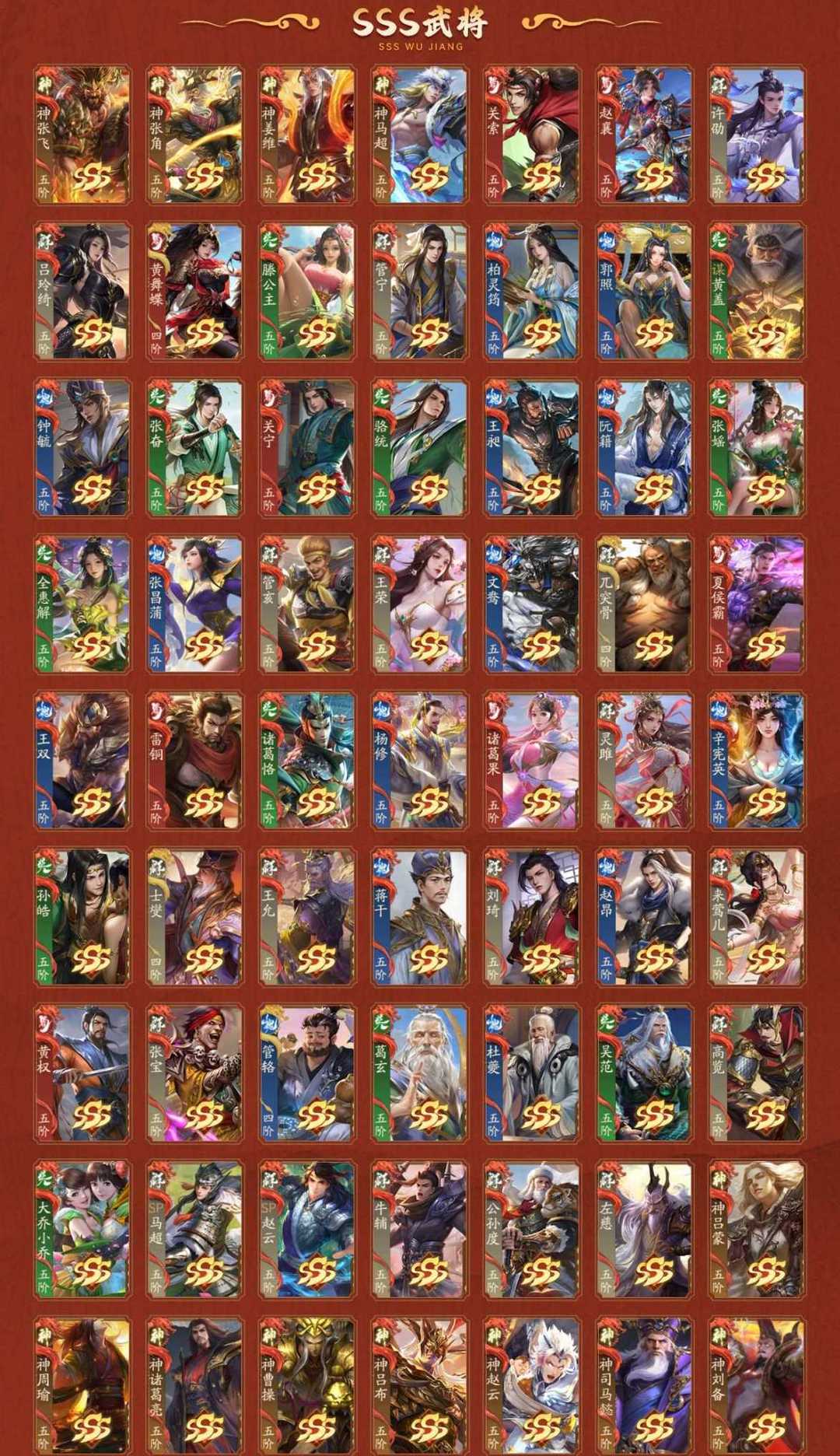 5神武,1谋,1乐,27阴间,2星河, [阴间] :神张飞(静),神张角(静),神姜维,神马超(静),乐蔡文姬,庞宏,袁胤,张旋,曹金玉(动),关索,赵襄(动),星曹仁,许劭(动),吕玲绮,黄舞蝶,公主,庞会,管宁,留赞,柏灵筠,郭照,曹宪,陈式,谋黄盖,蒲元,钟毓,张琪瑛(静);[神武]:神张飞(静),神张角(静),神姜维,神马超(静),神庞统;[谋]:谋黄盖;[乐]:乐蔡文姬; [星河] :星曹仁,星袁术,[SSS] :神张飞(静),神张角(静),神姜维,神马超(静),关索,赵襄(动),许劭(动),吕玲绮,黄舞蝶,公主,管宁,柏灵筠,郭照,谋黄盖,钟毓,张奋,关宁,骆统,王昶,阮籍,张徭,全惠解,张昌蒲(动),管亥,王荣,文鸯(静),兀突骨,夏侯霸(动),王双(动),雷铜,诸葛恪,杨修(动),诸葛果(静),灵雎(静),辛宪英,孙皓,士燮,王允,蒋干,刘琦,赵昂,来莺儿,黄权,张宝,管辂,葛玄,杜夔,吴范,高览,大乔小乔,SP马超,SP赵云(动),牛辅,公孙度,左慈(动),神吕蒙,神周瑜(动),神诸葛亮(动),神曹操(动),神吕布,神赵云(动),神司马懿,