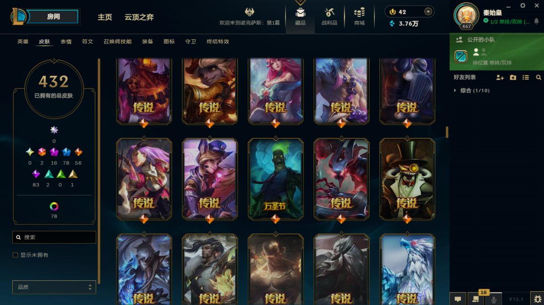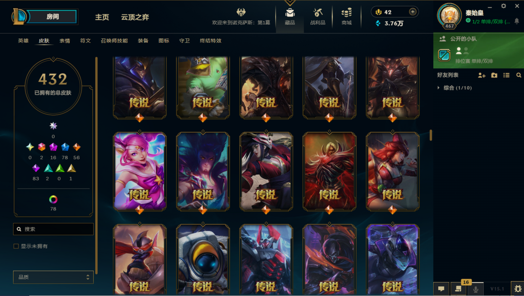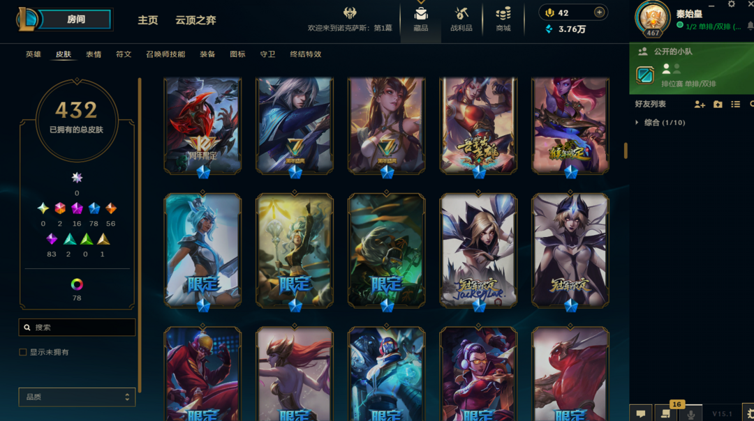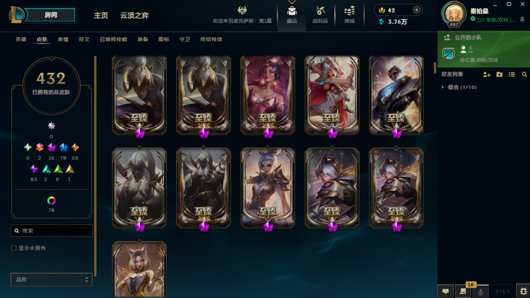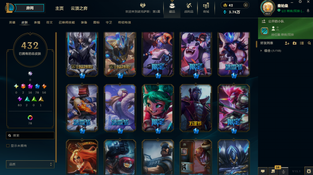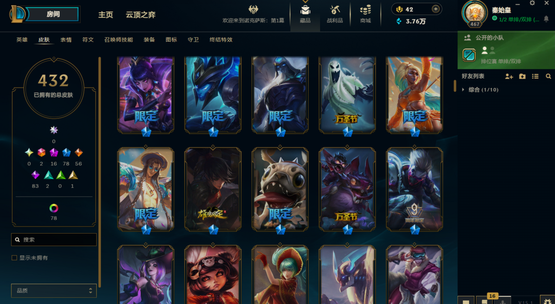 因为不喜欢抽奖,所以都是自己单个买的皮肤,皮肤比较精品,看截图吧,皮肤太多,懒得打字了。
