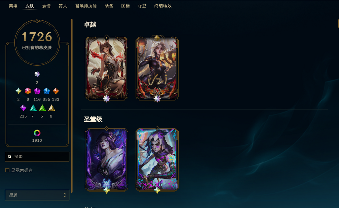 1726原皮+1918炫彩+180臻彩❤️三档卡莎❤️2圣堂❤️10神话皮肤❤️云顶至臻格温/阿狸/卡莎/EZ