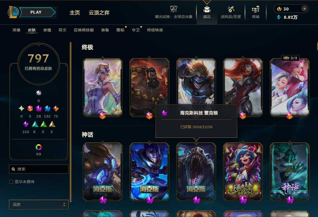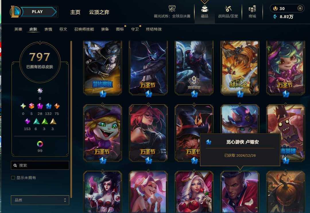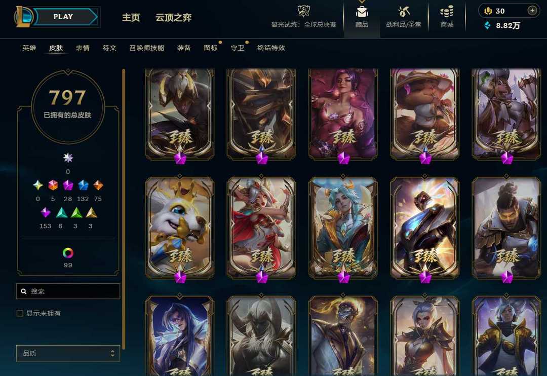【联盟三区】全皮1000★原皮797★炫彩343★臻彩14★段位实时★真实描述★