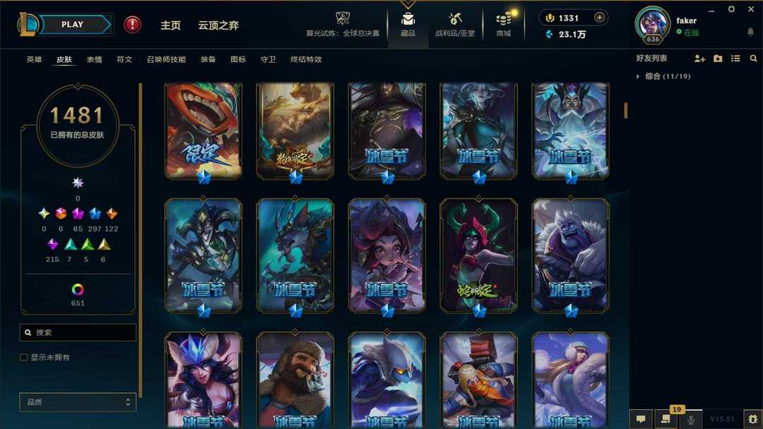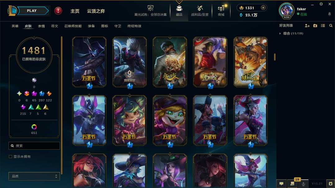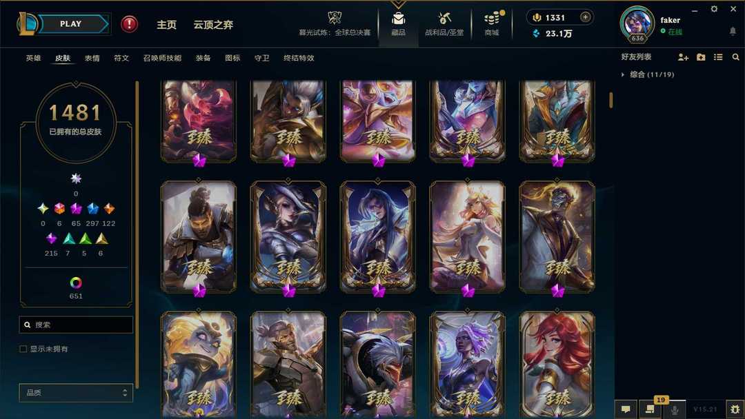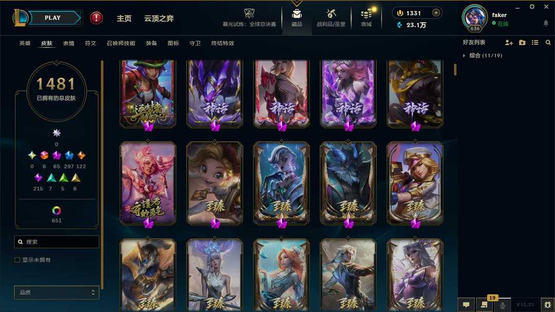 【泡泡】2100皮肤♥1481原皮♥651炫彩♥65神话♥43臻彩♥297限定♥122传说♥6终极♥