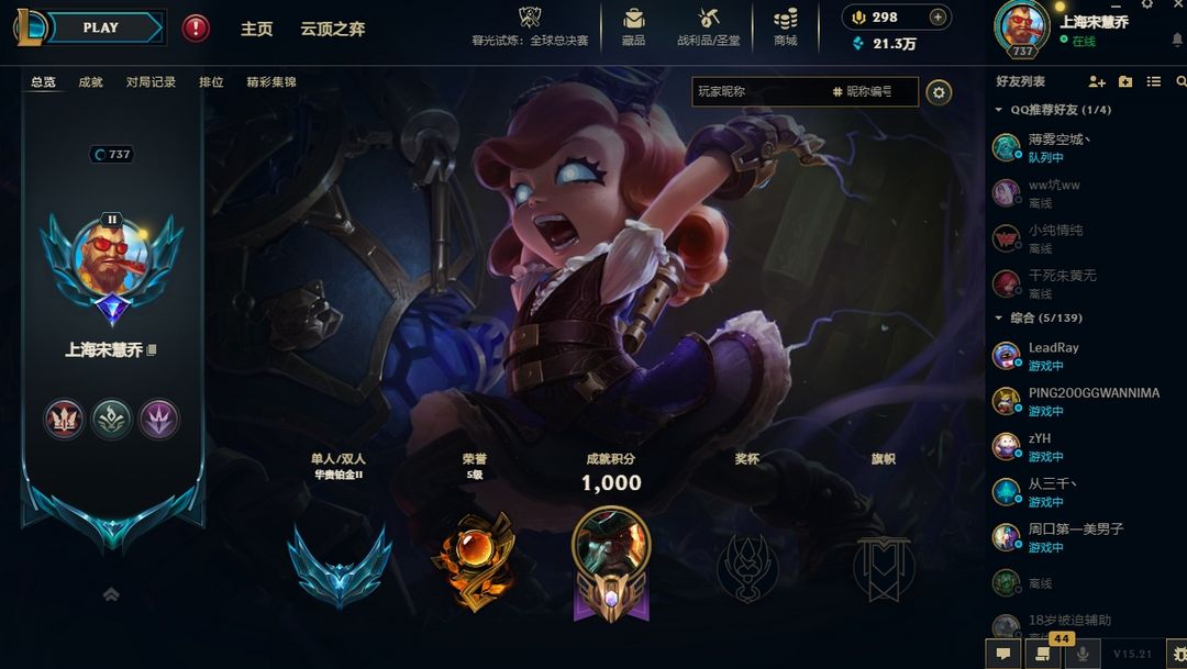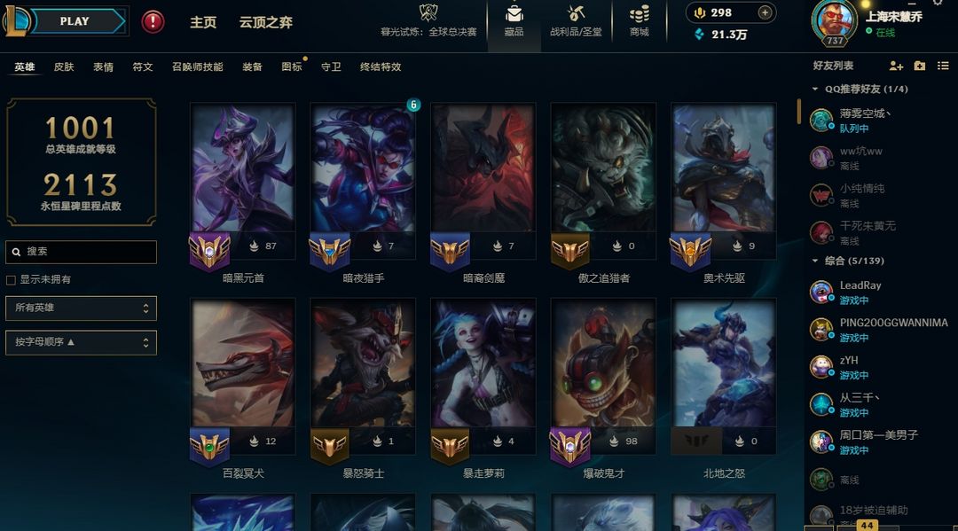 不顶人的上海萌妹儿号,全英雄,稀有皮肤,可排位,畅快玩