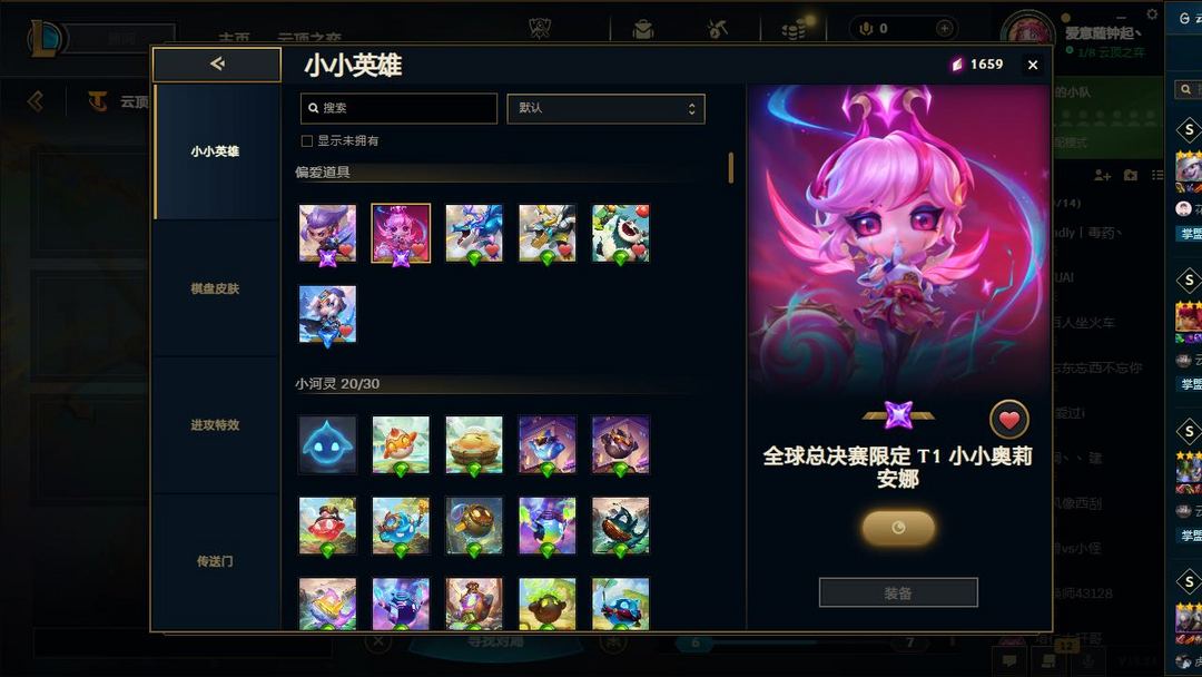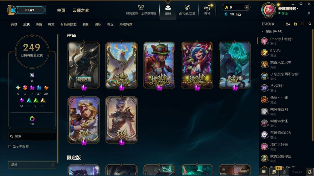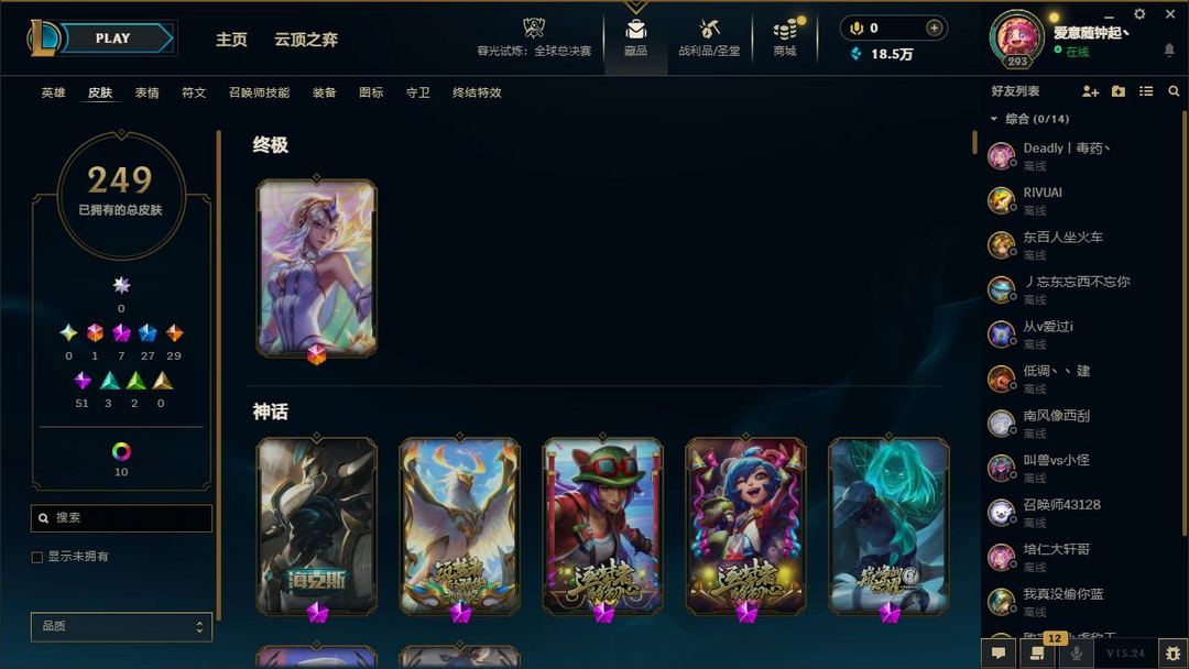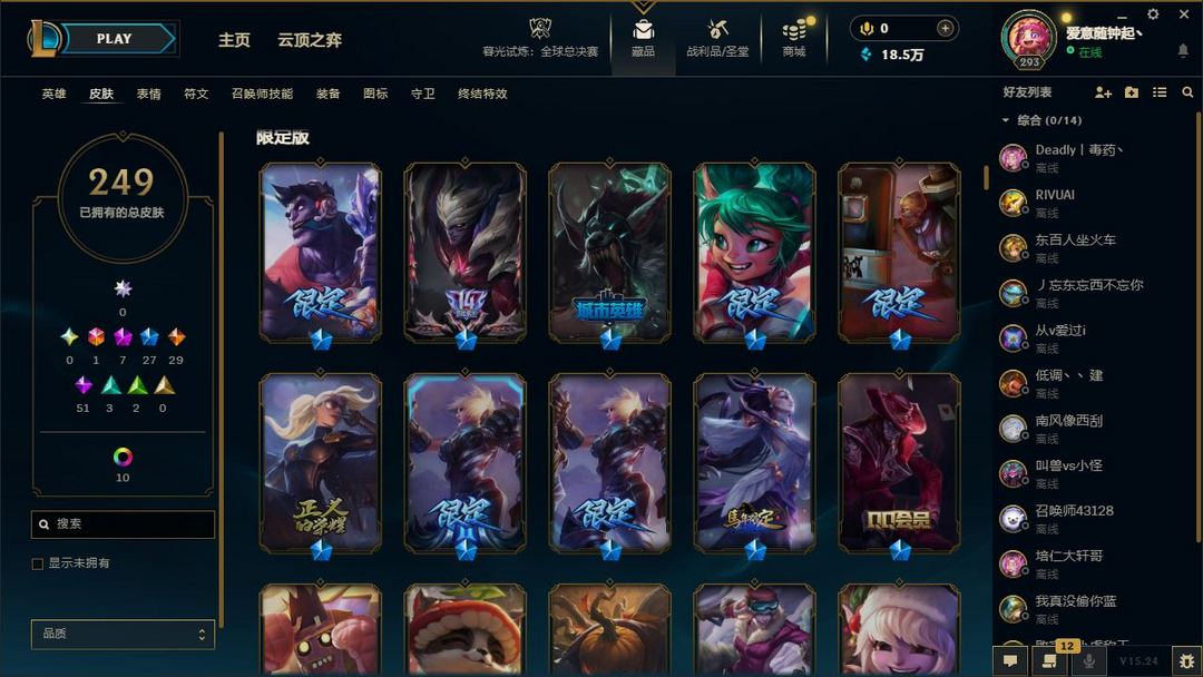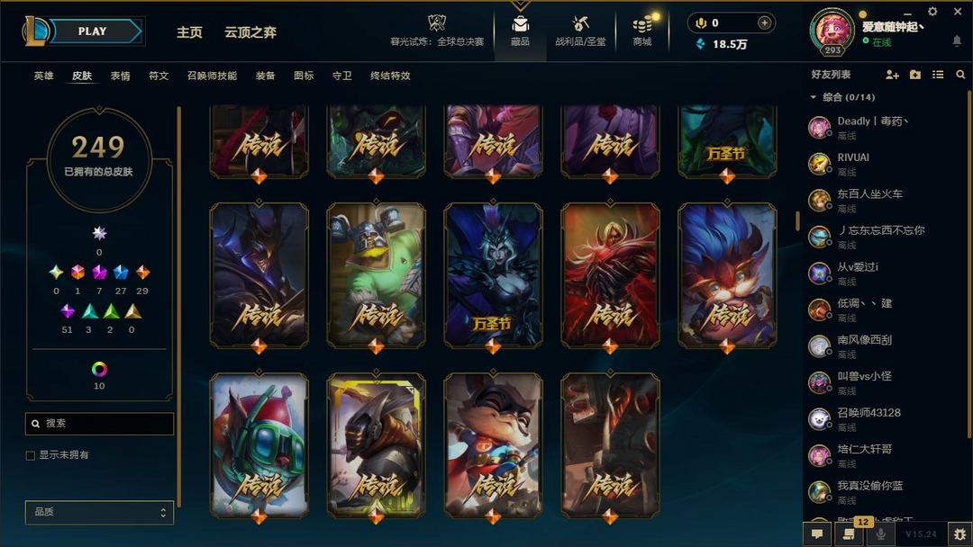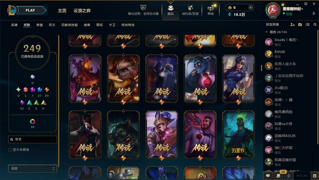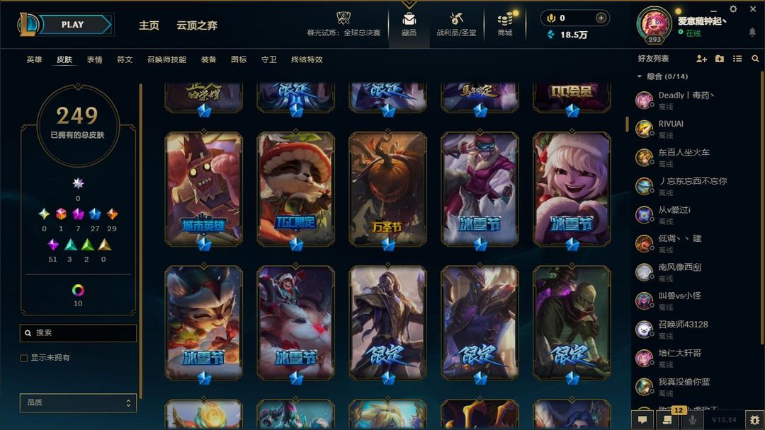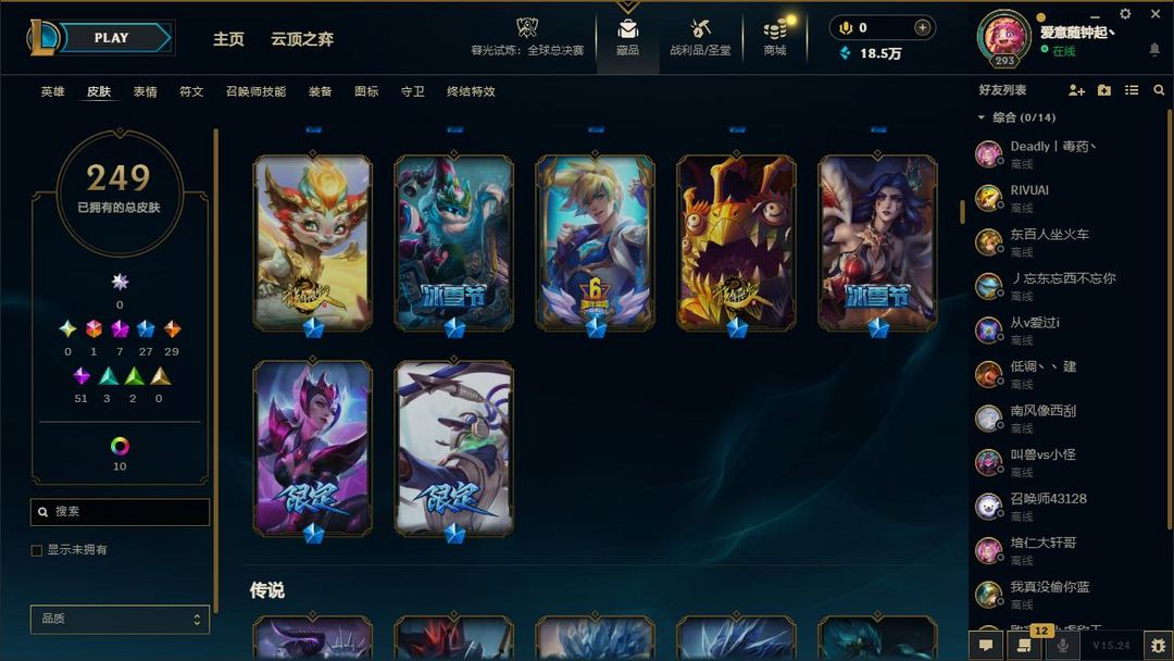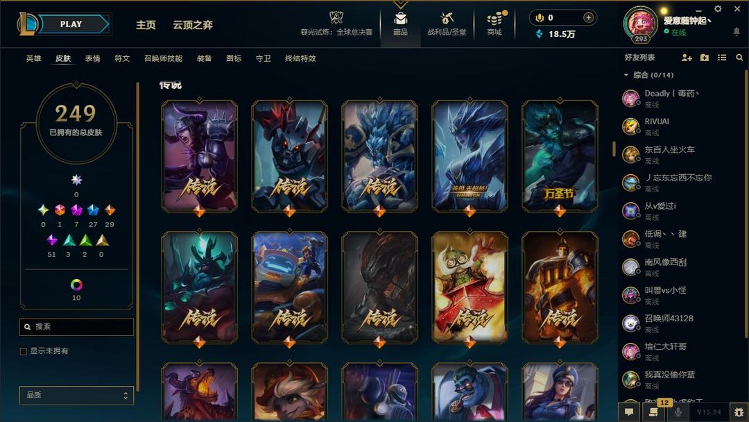 暗影岛200+皮肤,光辉元素大天使,海克斯人马,皎月嫦娥,龙年大嘴,冠军之刃锐雯等。云顶之弈有T1发条,夜月幻龙亚索,他俩的攻击特效都有