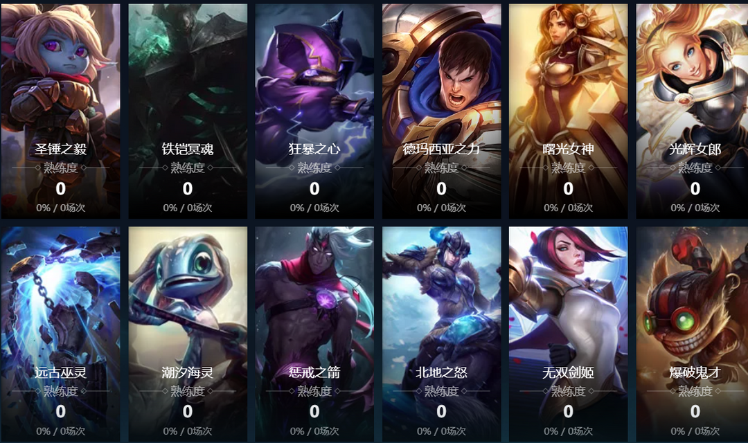 探险家;皮城女警;赏金猎人;寒冰射手;黑暗之女;德邦总管;远古恐惧;无极剑圣;牛头酋长;亡灵战神;战争女神;众星之子;迅捷斥候;麦林炮手;祖安怒兽;雪原双子;蛮族之王;武器大师;堕落天使;时光守护者;痛苦之拥;死亡颂唱者;虚空恐惧;殇之木乃伊;披甲龙龟;祖安狂人;琴瑟仙女;刀锋舞者;风暴之怒;瓦洛兰之盾;邪恶小法师;巨魔之王;诺克萨斯统领;蒸汽机器人;熔岩巨兽;永恒梦魇;德玛西亚皇子;发条魔灵;齐天大圣;复仇焰魂;盲僧;暗夜猎手;沙漠死神;兽灵行者;圣锤之毅;不屈之枪;铁铠冥魂;德玛西亚之力;曙光女神;刀锋之影;暮光之眼;光辉女郎;远古巫灵;龙血武姬;九尾妖狐;潮汐海灵;不灭狂雷;傲之追猎者;北地之怒;爆破鬼才;诺克萨斯之手;皎月女神;暗黑元首;荆棘之兴;虚空之女;疾风剑豪;弗雷尔卓德之心;戏命师;暴走萝莉;圣枪游侠;影流之主;时间刺客;皮城执法官;唤潮鲛姬;魔法猫咪;魂锁典狱长;海兽祭司;腕豪;不羁之悦