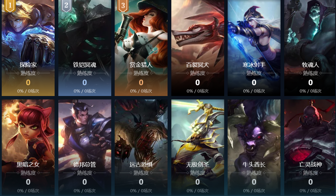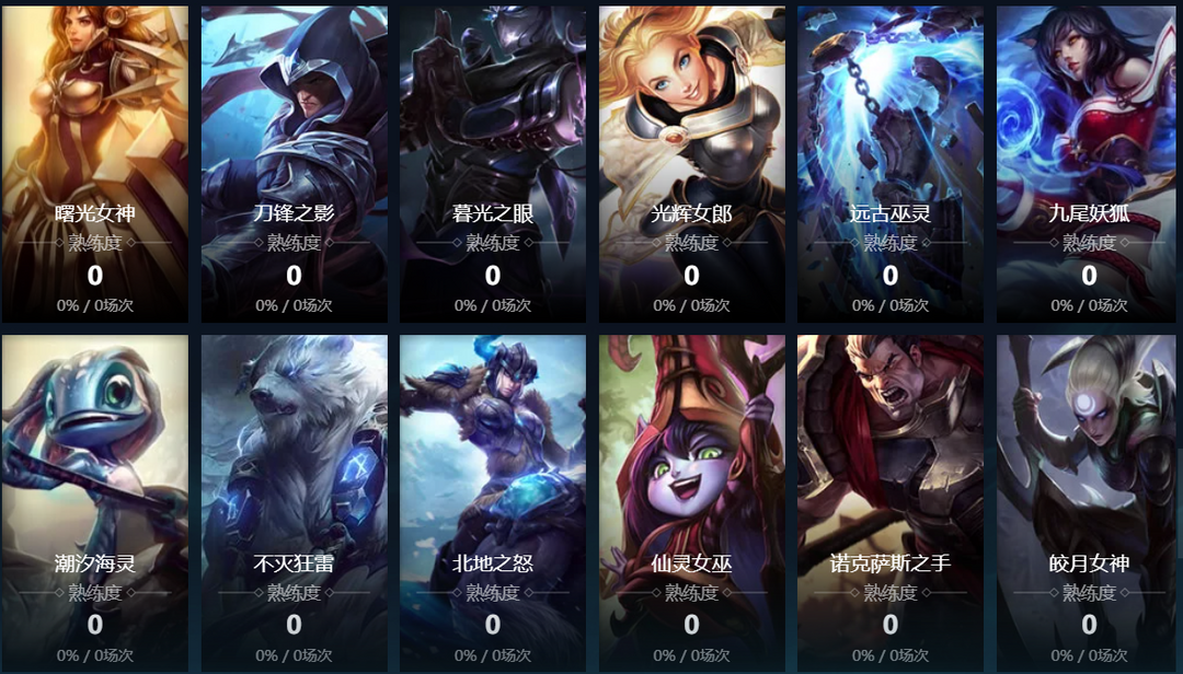 探险家;赏金猎人;铁铠冥魂;寒冰射手;百裂冥犬;牧魂人;黑暗之女;德邦总管;远古恐惧;无极剑圣;牛头酋长;亡灵战神;战争女神;众星之子;迅捷斥候;麦林炮手;祖安怒兽;雪原双子;蛮族之王;武器大师;堕落天使;时光守护者;痛苦之拥;虚空恐惧;殇之木乃伊;披甲龙龟;祖安狂人;琴瑟仙女;风暴之怒;瓦洛兰之盾;邪恶小法师;诺克萨斯统领;皮城女警;蒸汽机器人;熔岩巨兽;扭曲树精;荒漠屠夫;德玛西亚皇子;齐天大圣;复仇焰魂;盲僧;暗夜猎手;魔蛇之拥;沙漠死神;兽灵行者;圣锤之毅;不屈之枪;德玛西亚之力;曙光女神;刀锋之影;暮光之眼;光辉女郎;远古巫灵;九尾妖狐;潮汐海灵;不灭狂雷;北地之怒;仙灵女巫;诺克萨斯之手;皎月女神;虚空之女;疾风剑豪;虚空女皇;戏命师;暴走萝莉;圣枪游侠;影流之主;皮城执法官;魔法猫咪;海兽祭司;封魔剑魂;腕豪;纳祖芒荣耀