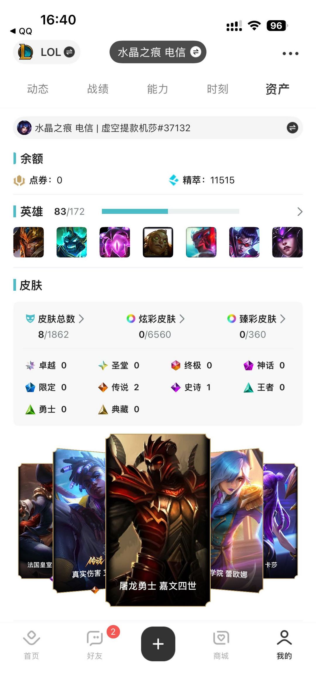 4. 低价租水晶之痕LOL账号,83英雄+8皮肤,艾克真实伤害传说皮体验拉满,账号安全无封禁,按小时/天租都可,随时可拍。有蓝色精粹可以买英雄