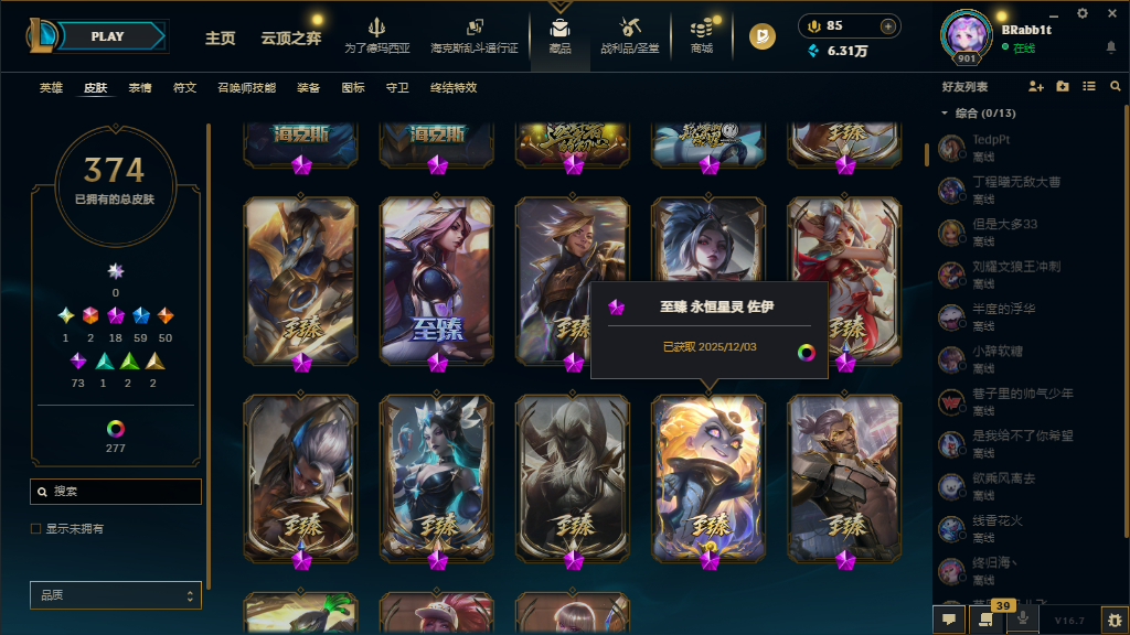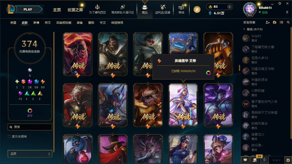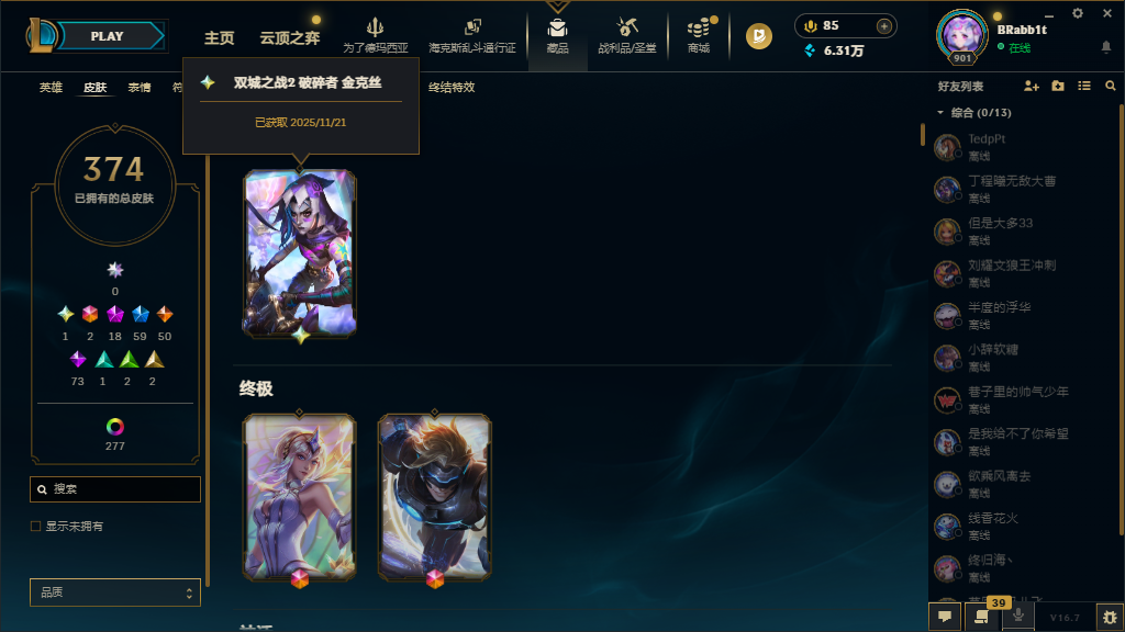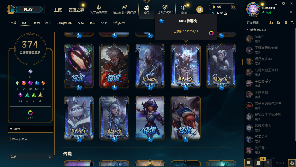 黑玫574皮35神话至臻⚡白银可排⚡圣堂金克斯⚡初代KDA至臻永恒星灵传说艾希⚡EDG签名套⚡新皮多