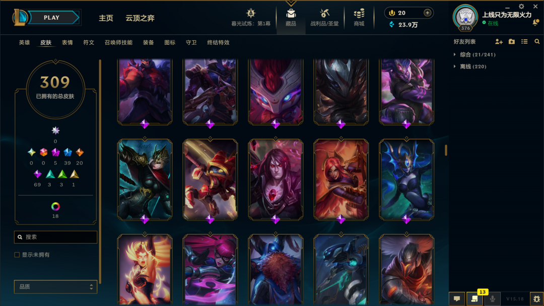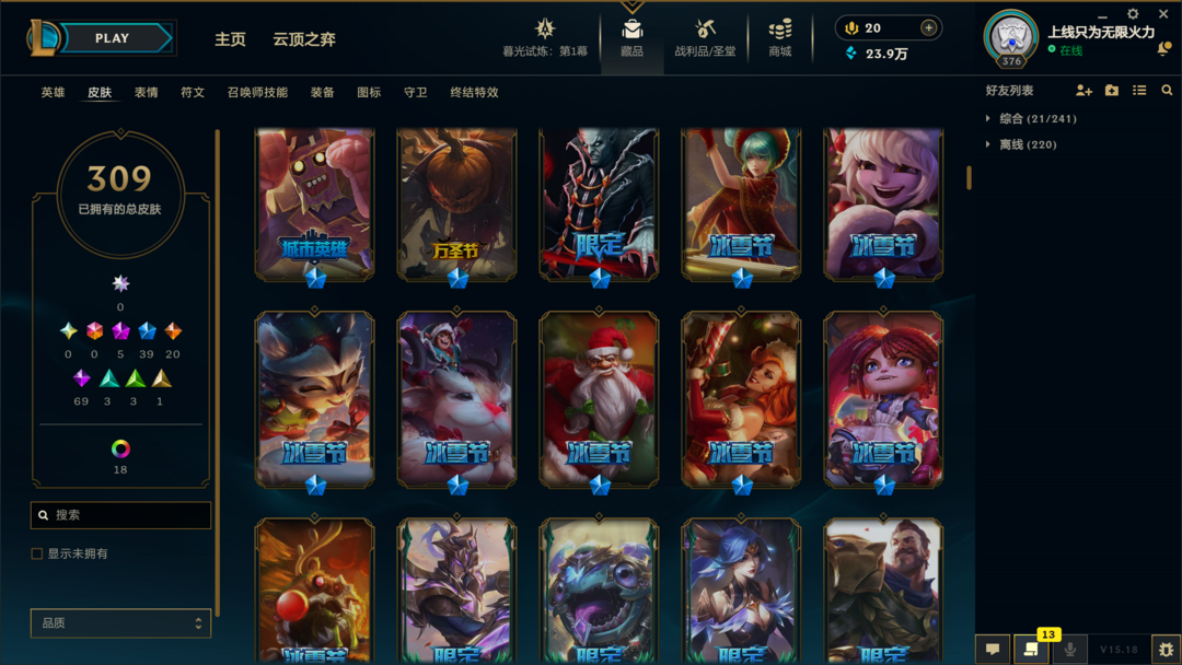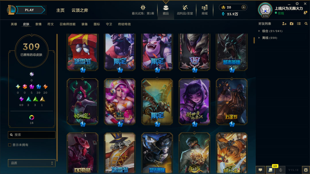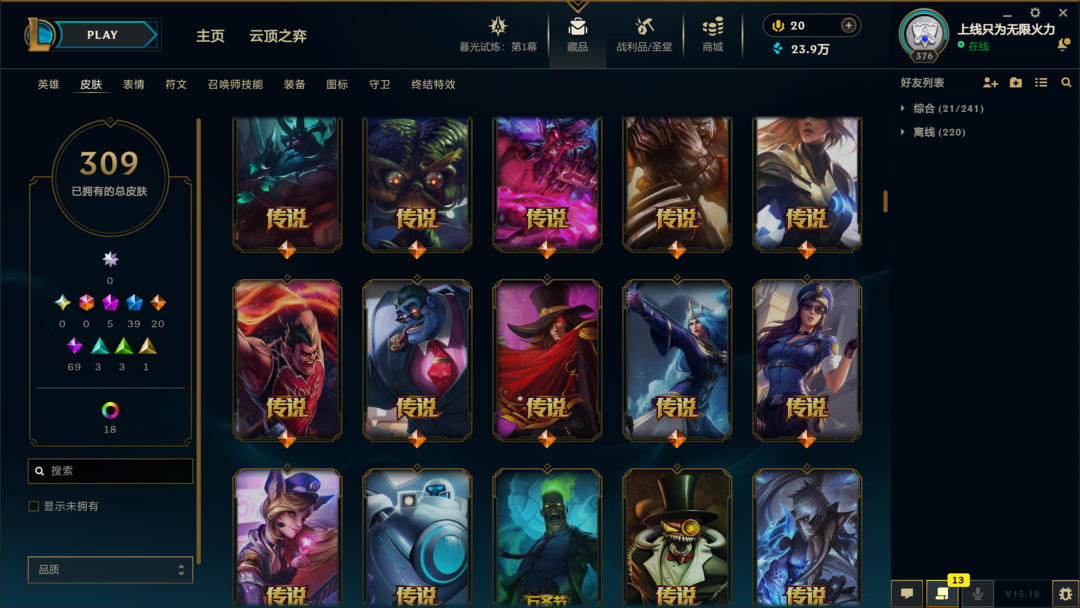 300皮肤〓10至臻海克斯〓龙瞎哥特〓水晶卡兹克〓神龙尊者盲僧,亚索