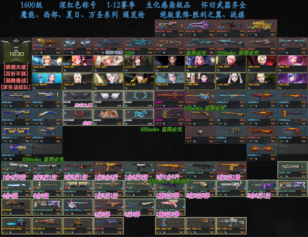【请勿使用账号芯片】 【有建议请您⑤星好评+留言,谢谢】 ★深红色称号,极品怀旧、极品感染号。 ★绝版装饰-战旗、胜利之翼(黑翅膀)。 ★怀旧斧头、怀旧黑龙炮、怀旧电锯、生化感染武器,全十周年武器。毁灭者、圣诞毁灭者等,全武器+8完美改造。生化感染、红蓝新经典、怀旧模式极品号。 ★具体请看图片。 【玩过别忘收藏!!!用心打造极品账号,给您最棒的游戏体验!】