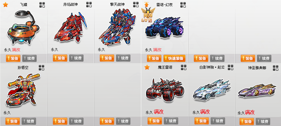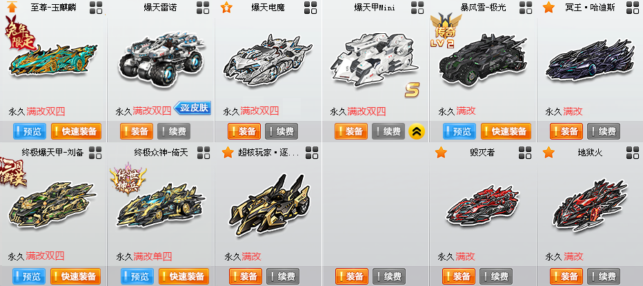 〓S〓12辆〓至尊火麒麟-玉麒麟、爆天雷诺、爆天电魔、终极爆天甲-刘备、终极众神之神-倚天、冥王哈迪斯、毁灭者、地狱火、暴风雪、超核玩家·逐魂者 〓T2〓3辆〓 〓A〓雷诺-幻夜5阶、魔王雷诺、神圣雅典娜、白影神驹·赵云 〓C〓飞碟 〓骑宠〓6只〓雪凝公主+10 〓其他〓9W魅力、800W荣誉、紫钻7、皇族7 〓女〓50页套装〓 〓男〓80页套装〓