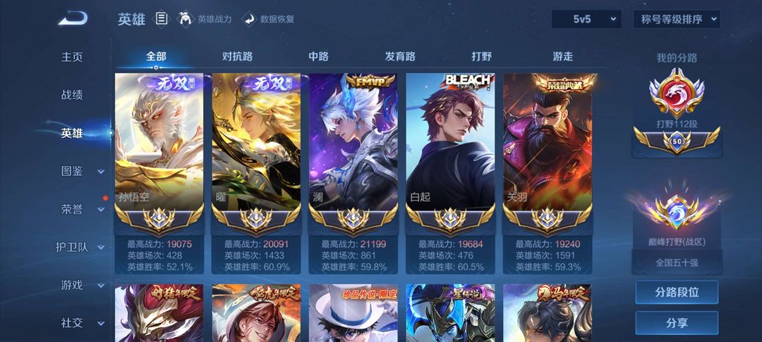 正式服在榜112段巅峰打野马年限定皮肤❤️历史10国服2w1战力澜2万战力曜1万9猴子玄策老虎马克