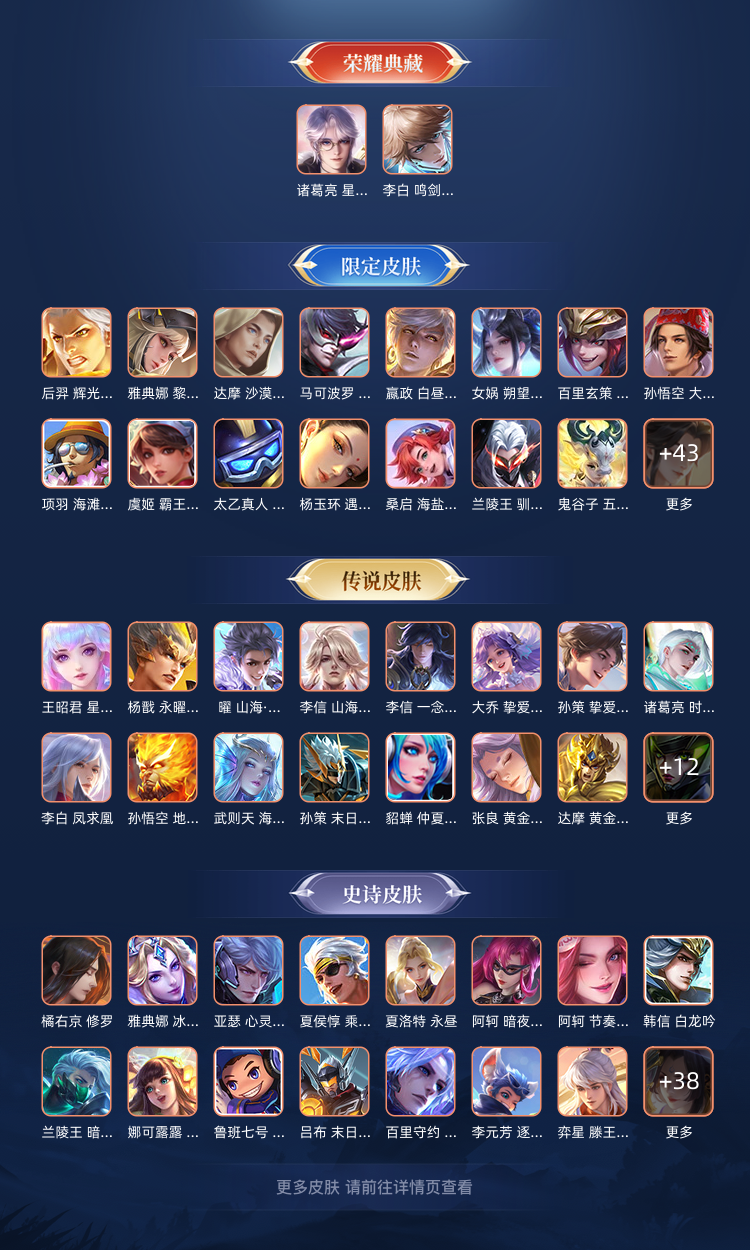 全英雄,慕夏,马年满氪,蛇年满氪,后羿李元芳曹操盘古满氪皮肤。剩下的看图片