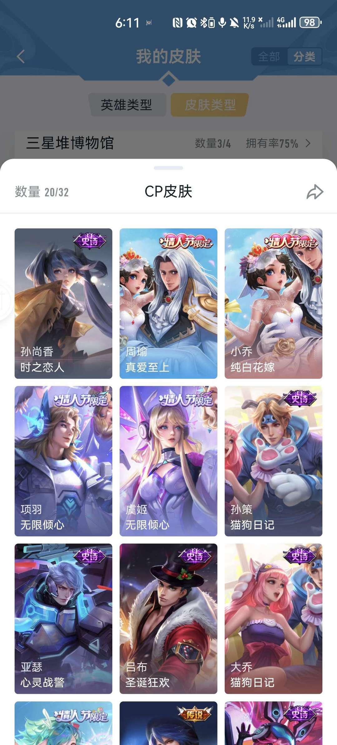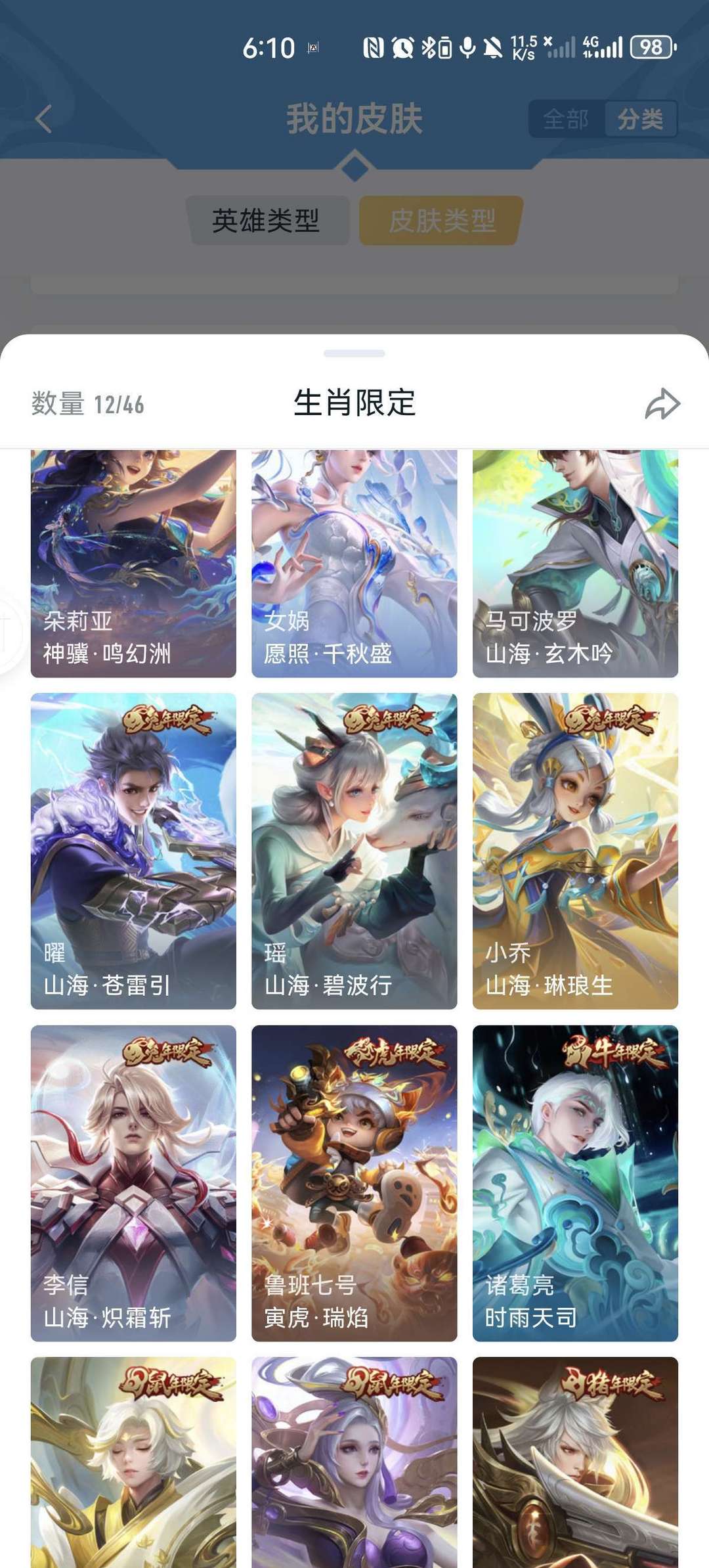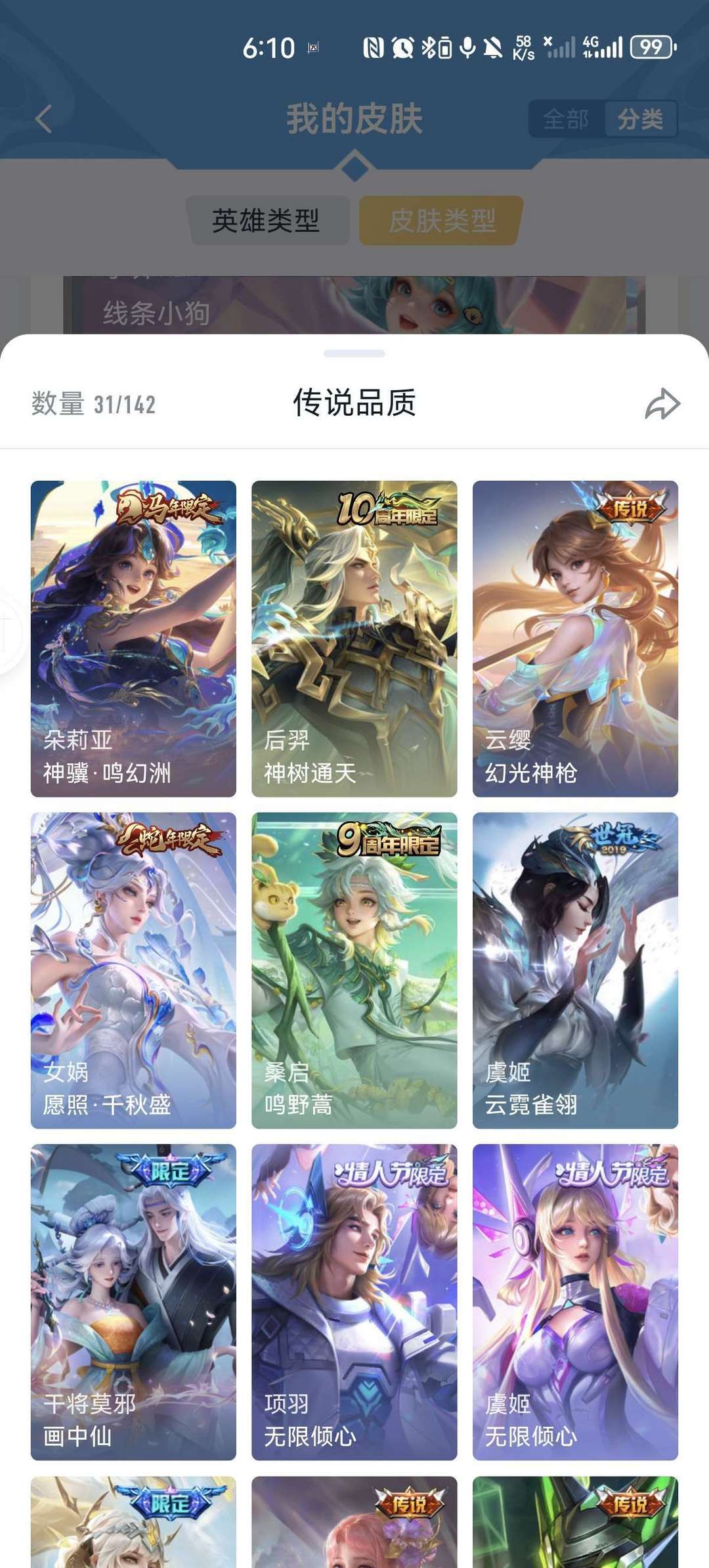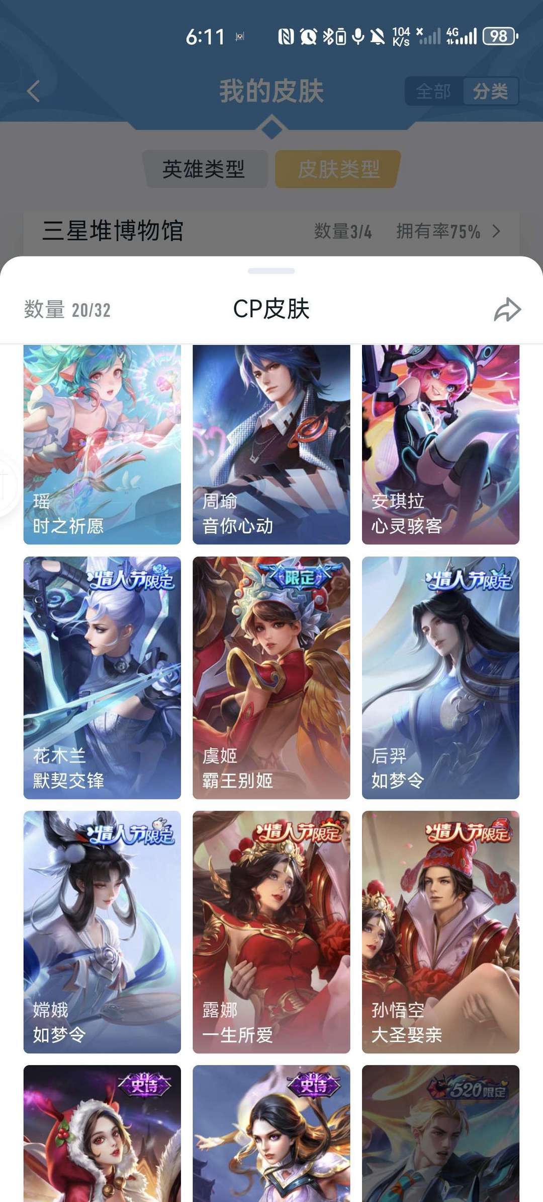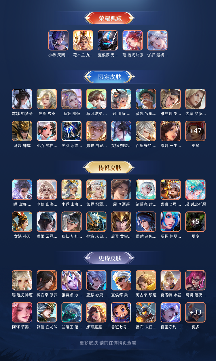 v9,李白虞姬世冠,马超五虎上将,女娲全皮,情侣皮有霸王和机甲的虞姬项羽,小乔周瑜花嫁,瑶时之祈愿,大圣娶亲悟空露娜,后羿嫦娥如梦令,年限兔年全皮