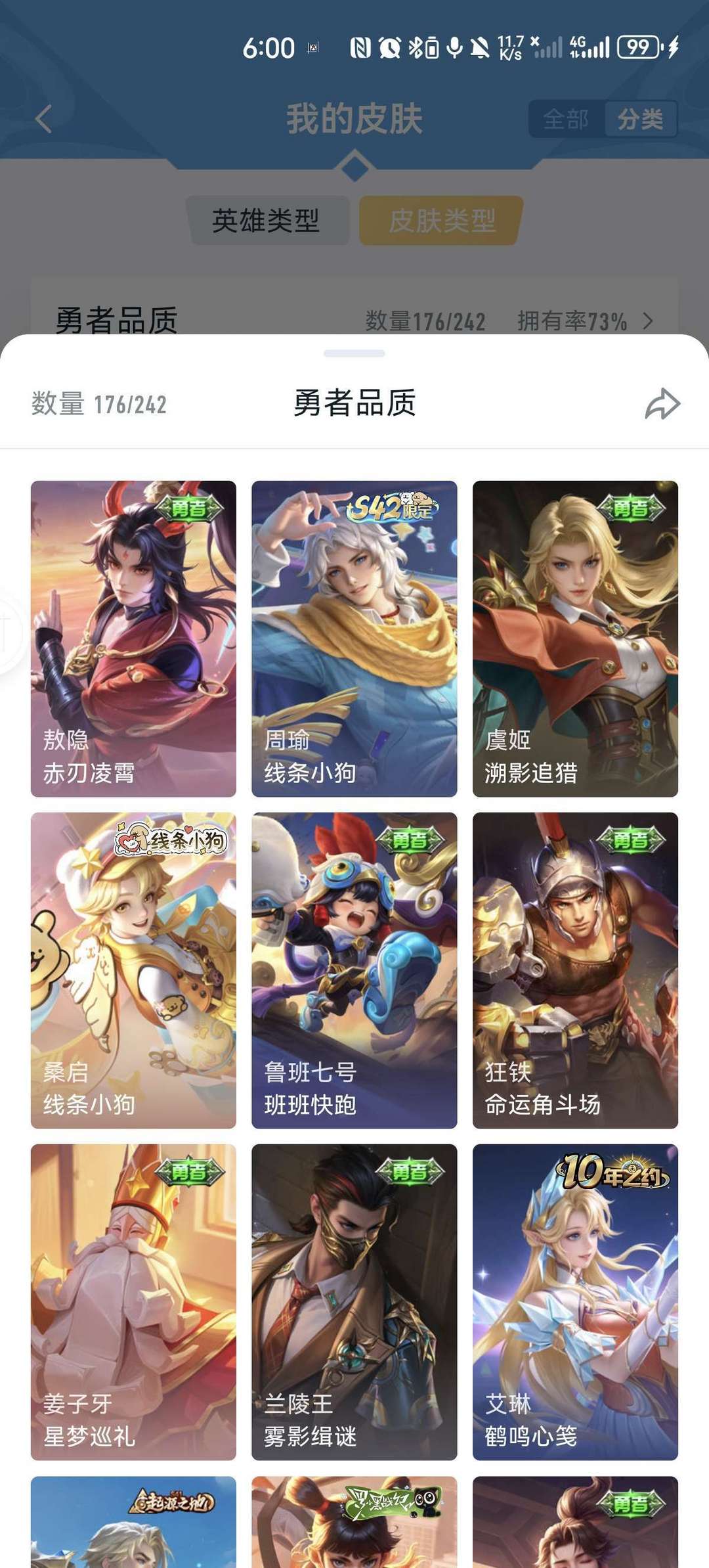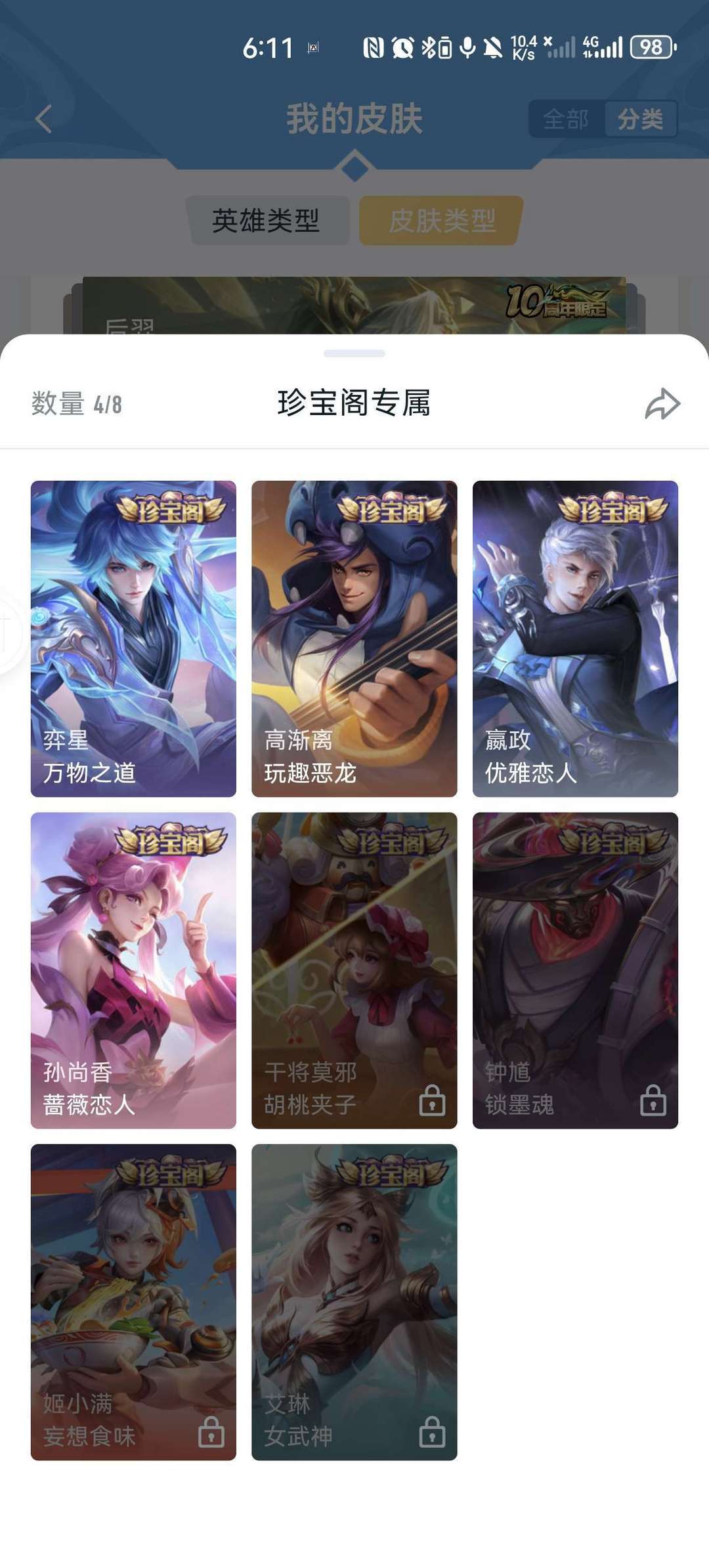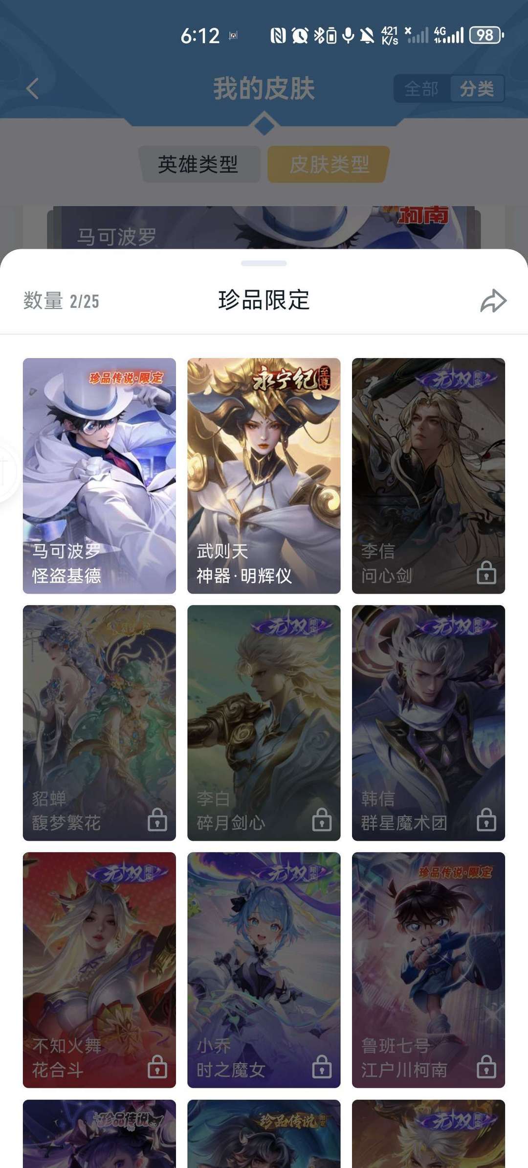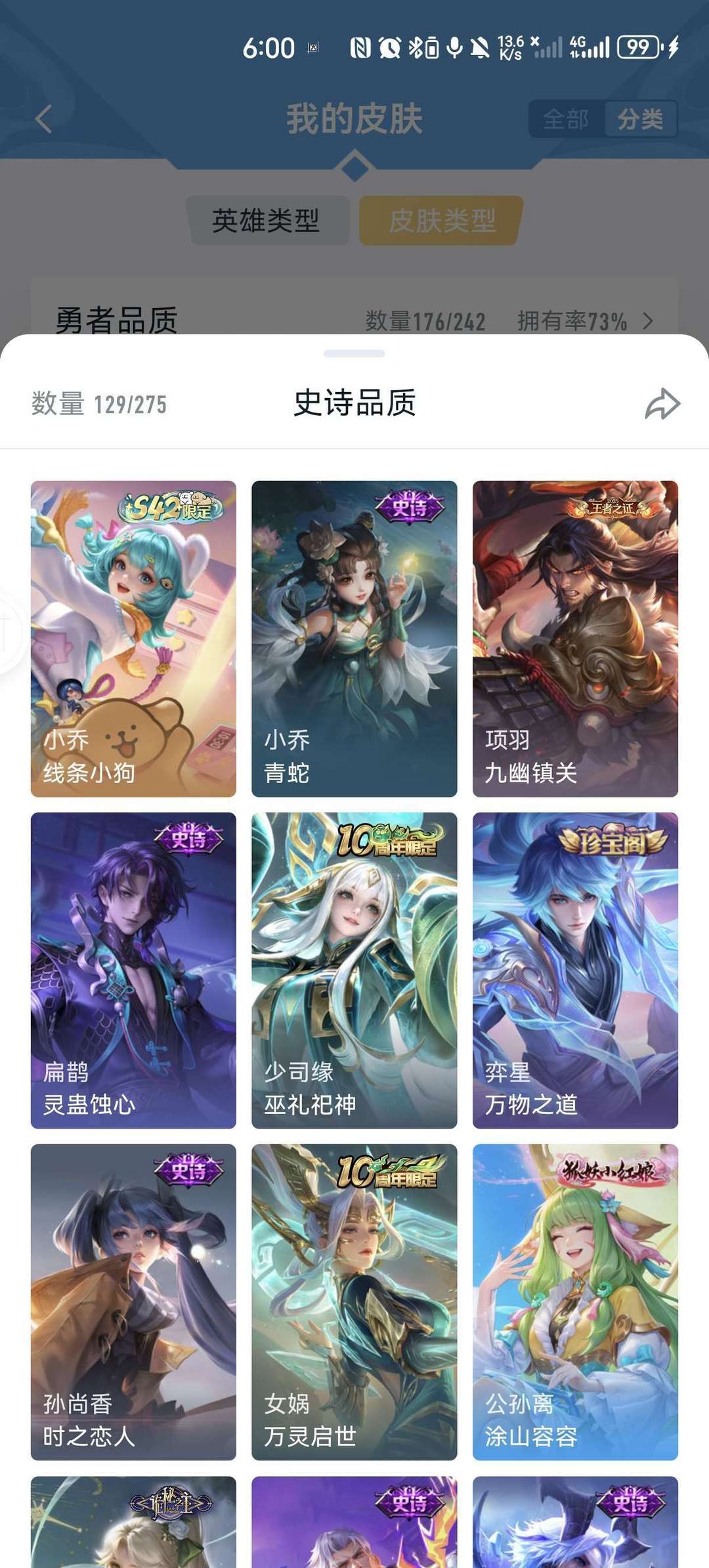 v9,李白虞姬世冠,马超五虎上将,女娲全皮,情侣皮有霸王和机甲的虞姬项羽,小乔周瑜花嫁,瑶时之祈愿,大圣娶亲悟空露娜,后羿嫦娥如梦令,年限兔年全皮