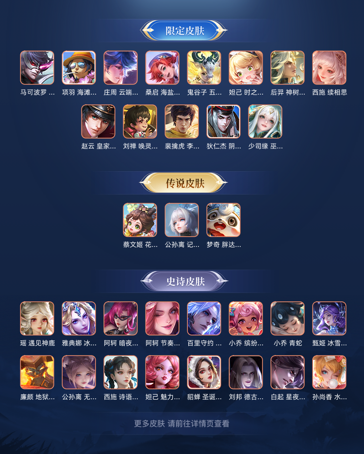 限定皮肤数量:50传说皮肤数量:13英雄数量:94皮肤数量:114