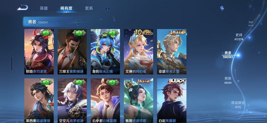 129英雄;196皮肤(59限定);5传说;47史诗;104勇者;40其他;