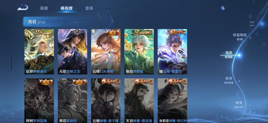 129英雄;196皮肤(59限定);5传说;47史诗;元歌传说;收藏开黑备用;