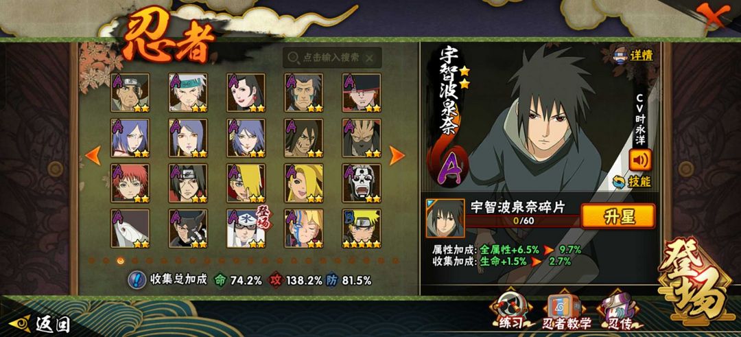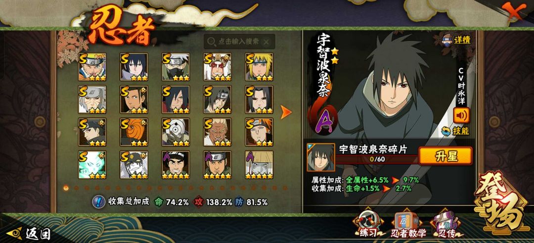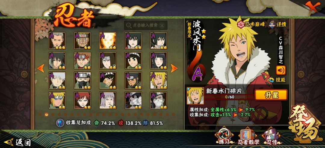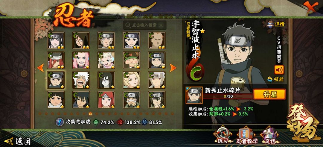 198忍者多多,创立初代,须佐止水,五影斑,大筒木舍人,桃氏,新水,新南,漂泊扉间,漂泊佩恩,漂泊小南,漂泊带土,暴怒小孩。b忍有忍者少女全套,七夕月光疾风跟卯月夕颜(月光疾风有历史国标)。c忍有忍者新秀鼬跟止水,少年三忍(自来也,纲手,大蛇丸),少年扉间,少年柱间,少年斑,少女玖辛奈,少年奇拉比,少年长门弥彦,青蛙小队小南,迈特戴,漩涡博人,小巳月。请游戏局内保持文明,防止禁言影响他人游戏,祝您玩得愉快!