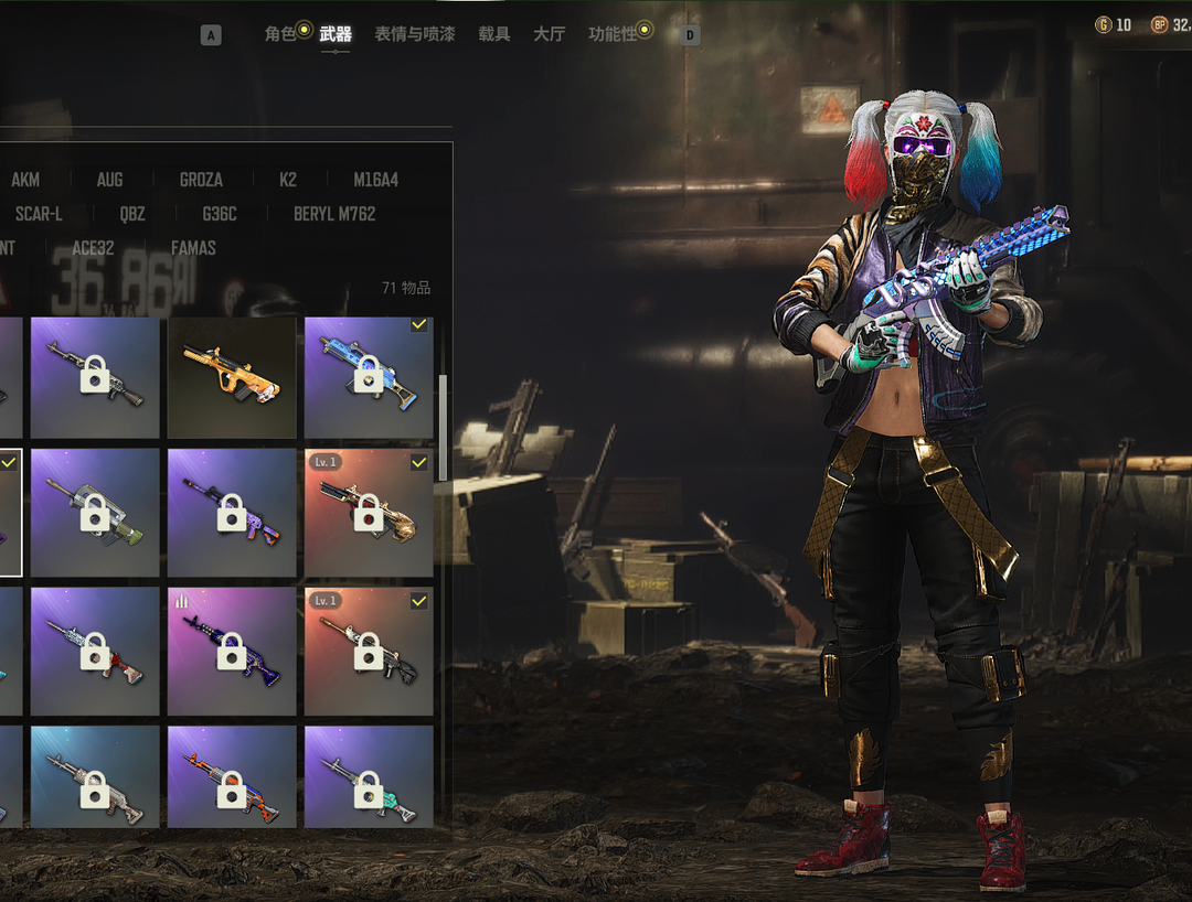 悲喜柏林男女小丑阿斯顿马丁迈凯伦满级南瓜M4墨子m24毒液762破碎ak恶魔ACE美八级异色白蛇杜莎762橙蓝烟枪猛虎套