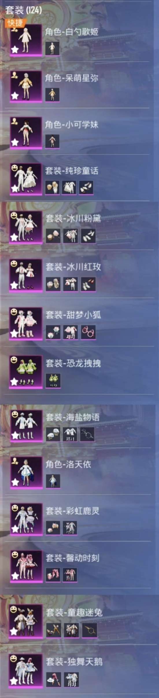 白芍歌姬,呆萌星弥,小可学妹,寒光使者,宝贝奶油派,纯真童话,甜梦,小狐,童趣迷兔,林间仙鹿三件套,馨动时刻,独舞天鹅,洛天依,冰川粉黛,冰川玫瑰,恐龙拽拽。