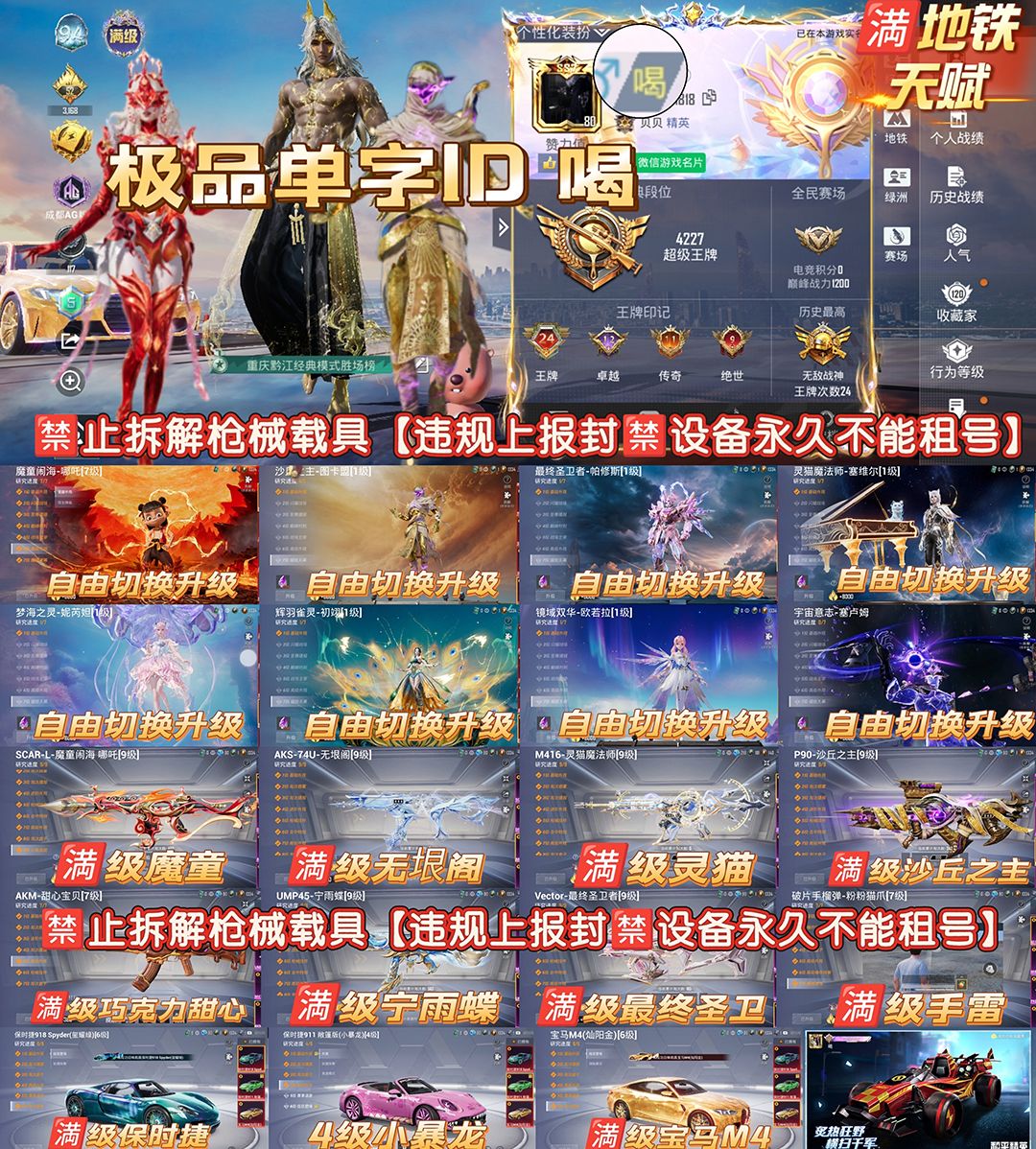 特别声明!!!! 分解载具枪械永久拉黑不解除 【乱投诉拉黑】和平号有问题/上不去/其他问题/ 特殊需求/投诉没用等问题 账号累计充值超40万!切勿开挂/分解装备/恶意骂人/等等违规行为,发现违规必追查到底(平台登录记录,游戏登录ip手机号 设备串号 充值付款记录不要侥幸现在网警都能调到你的所有行为记录就算盗用他人信息也一样能查到你头上)按账号充值金额=起诉/刑事立案/追责赔偿! 非速玩【非云!本机设备畅玩不卡顿】