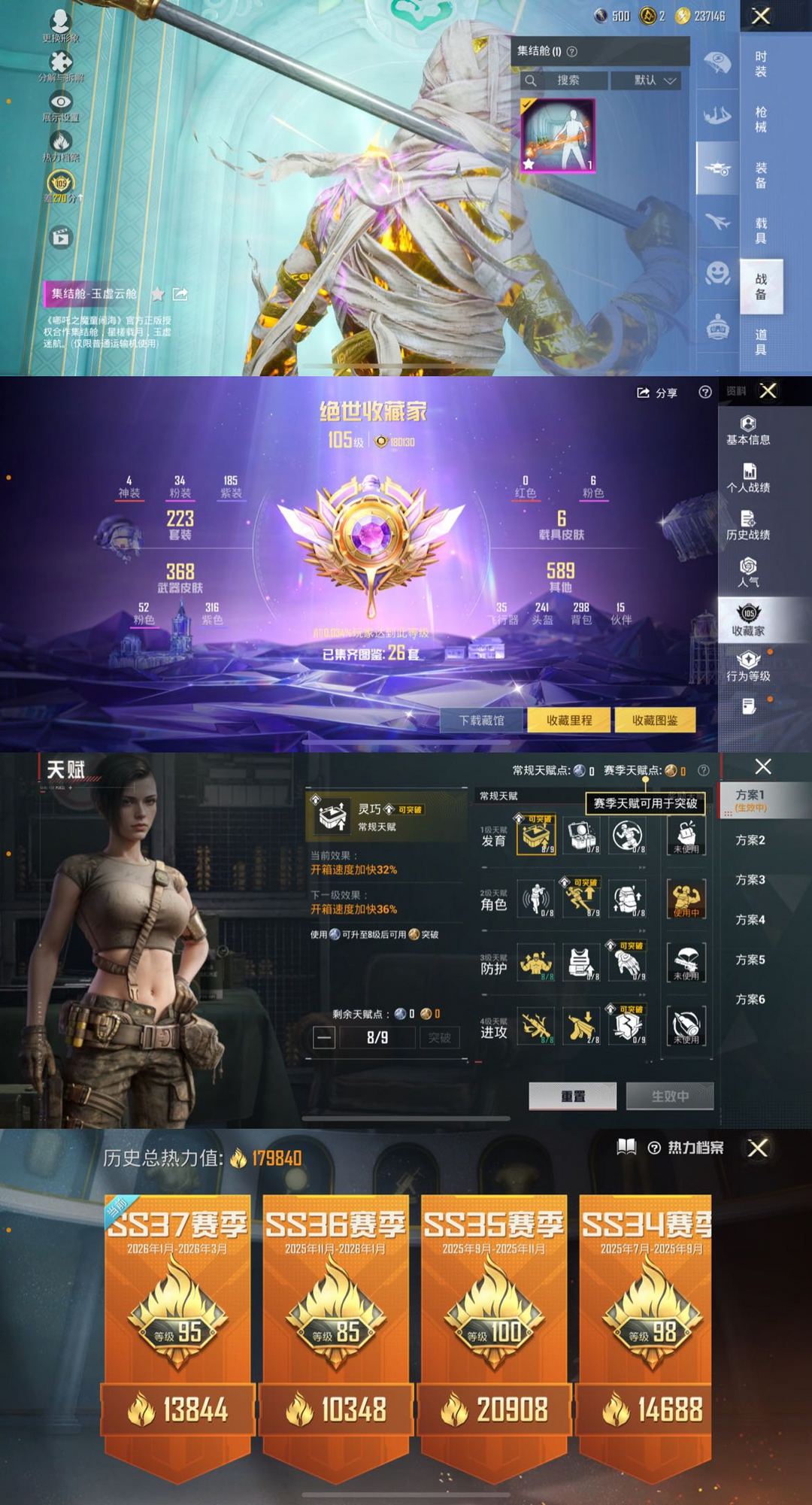 6级木乃伊哪吒雪国巧克力/满级万古烈焰斯噶/满级无垠阁/8级幽焰骑士AK/4红34粉52特6载具