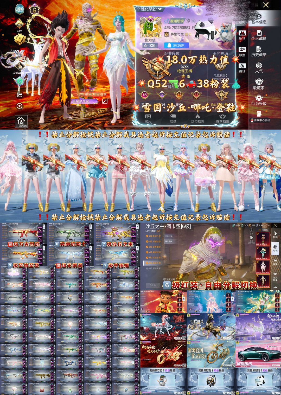 毁号,涉及毁坏虚拟财产罪及计算机安全罪,请文明游戏素质游戏,让我们共建美好租号平台 【特别事项】 红装可任意分解升级所需要满级的红装 禁止分解枪械载具,违者拉黑起诉赔偿 非账号问题撤单的全部永久拉黑 A.游戏过程中请不要恶意挂机或者不文明发言 B.恶意挂机、顶号等行为将被拉黑无法再次下单 C.进入游戏后中途请勿退出登陆,否则无法再次上号 D.部分账号由于异地登录可能会出现密码错误提示,通常再尝试5-6次后可上号 喜欢本账号请点 ☆收藏☆ 方便下次租用,谢谢光临惠顾