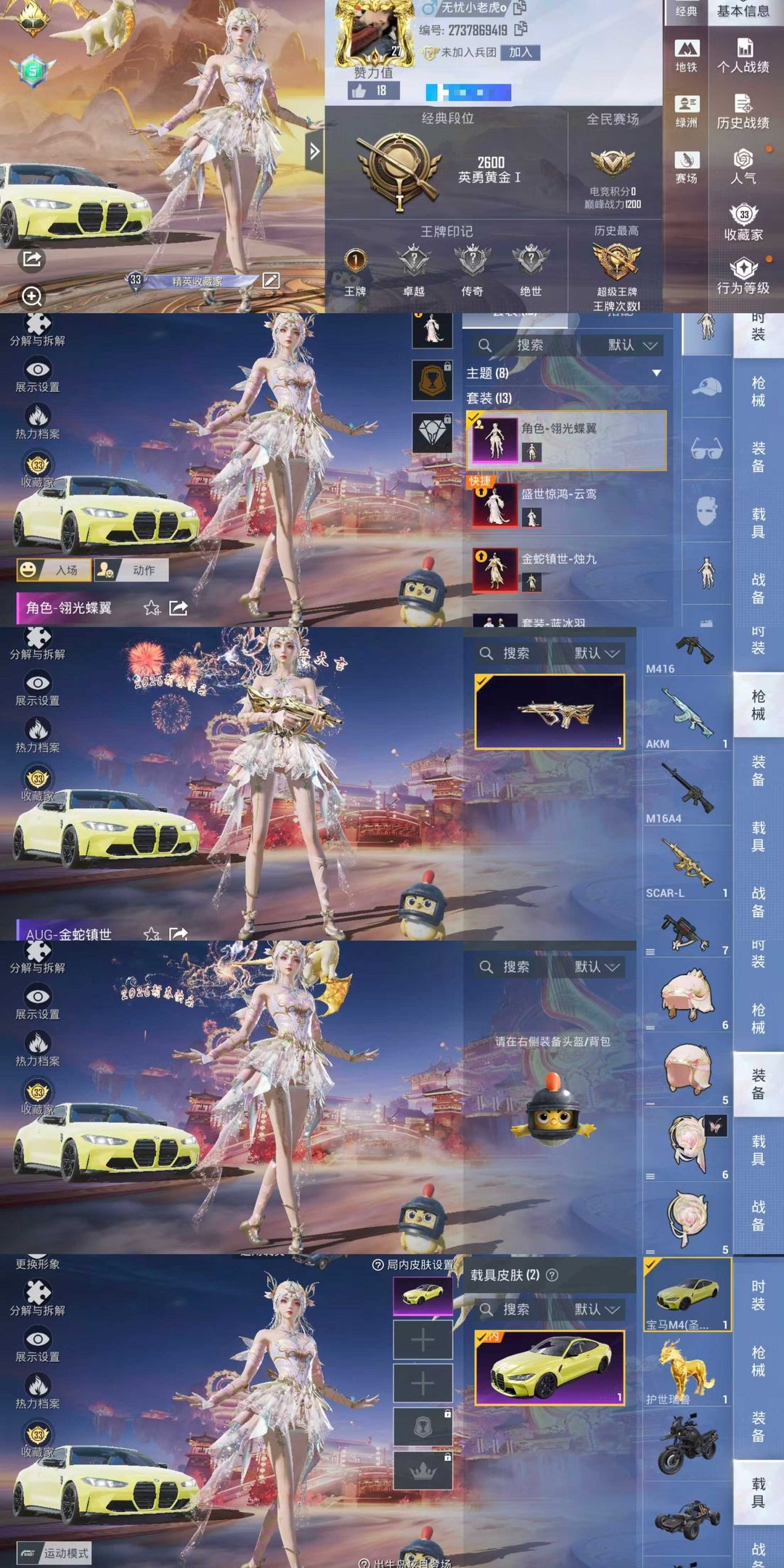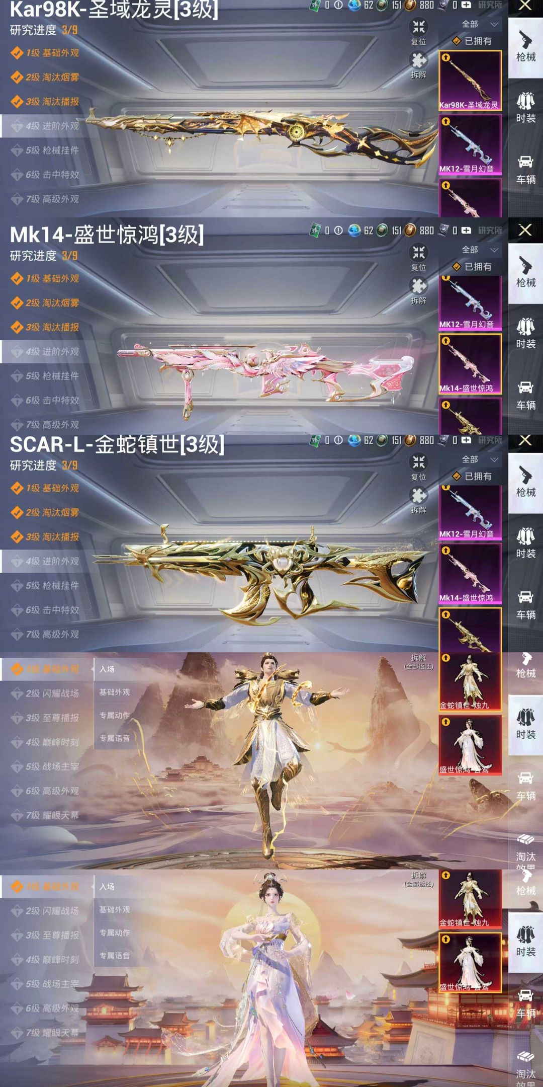 云鸾⭐烛九⭐翎光碟翼⭐3级圣域龙灵⭐妹控盛世惊鸿⭐SCAR金蛇镇世⭐金宝马⭐麒麟马皮⭐2红1粉5特2