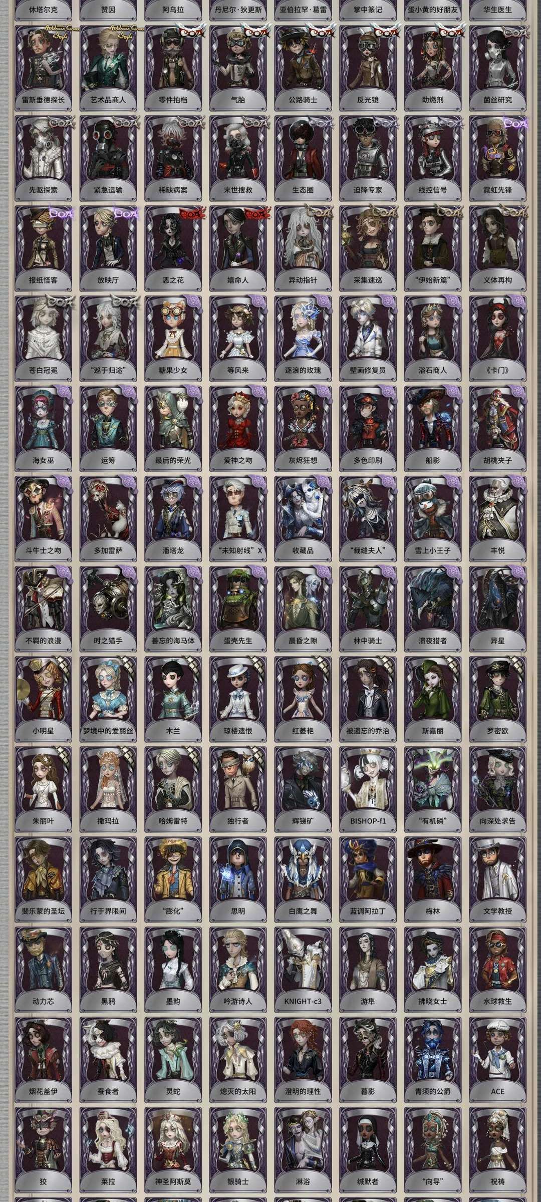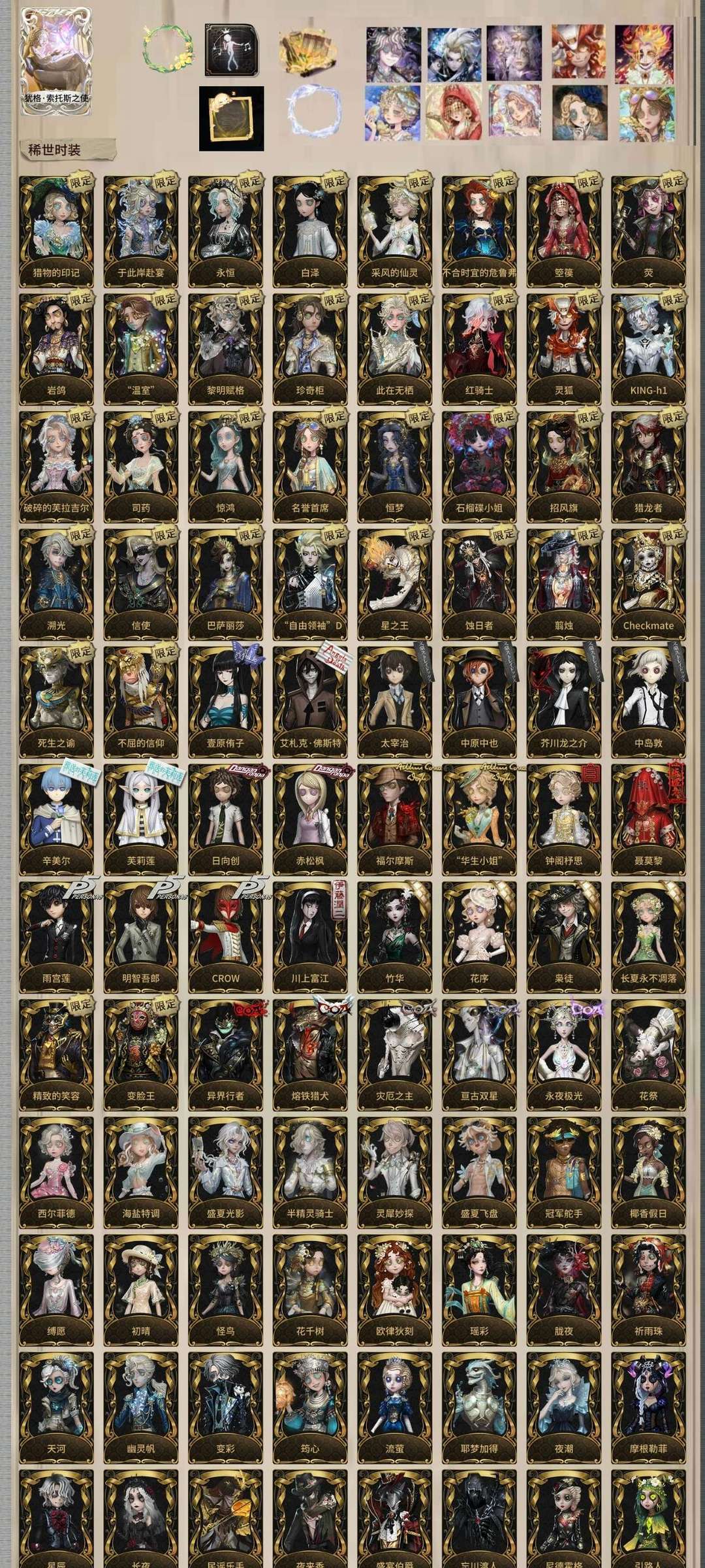 蚀日者 白泽 黎明赋格 kingh1 灵狐 红骑士 猎物的印记 珍奇柜 荧 永恒 惊鸿 破碎的芙拉吉尔 箜篌 名誉首席 巴萨丽莎 信使 岩鸽 石榴碟 温室 星之王 采风的仙灵 不合时宜的危鲁弗 死生之谕 自由领袖 辛美尔 芙莉莲 聂莫黎 舞女故宫 华生小姐 福尔摩斯 赤松枫 日向创 太宰治 中原中也 中岛敦 芥川龙之介 川上富江 雨宫莲 明智吾郎