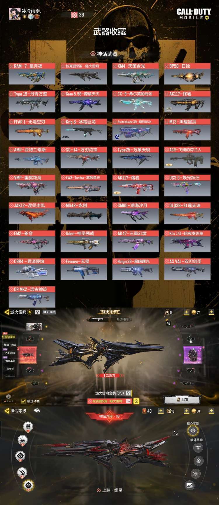 ♥全神话满级:幽冥花海,离散单元,熔岩,天策含光,焕光跃迁,涅槃炎凤,日蚀,永别了战争,丹青万壑,源核天灾,希尔芙,终墟,无境空刃,潮海汐月,红莲天珠,苍穹EM2,冰霜巨龙,瞬影斩诀,神圣惩戒,三重幻境,暗夜奏鸣曲,异源侵蚀,黑耀星辰,亚特兰蒂斯,无畏,黑暗曙光,双刃剑圣,远古神迹