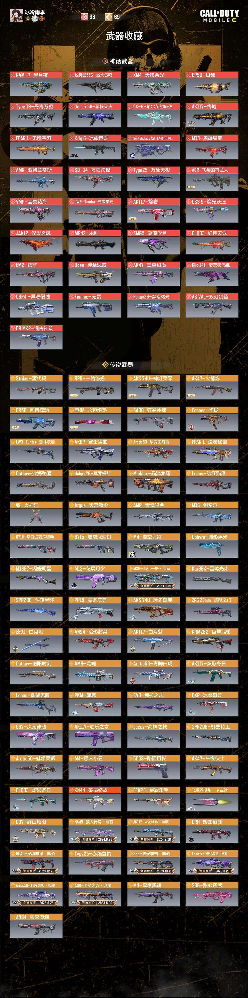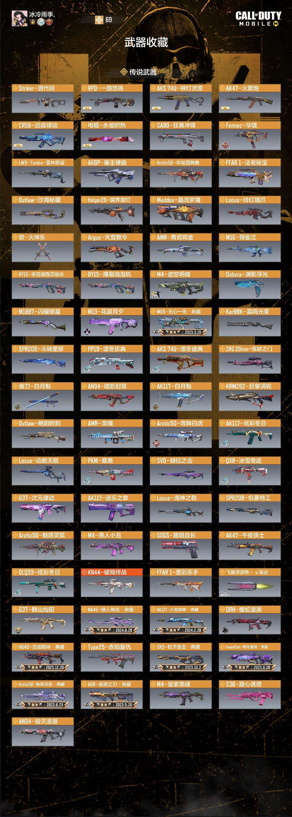 ♥23把狙:雪林歌谣,动能无限,绯红猫爪,海神之戟,机要特工,斗转星移,红莲天珠,炫彩冬日,亚特兰蒂斯,龙魄,青瓷鸣金,赫拉之击,华丽圆舞曲,青眸白虎,魅惑灵狐,魅惑灵狐典藏,炼狱之门,流星漫步,沙海密藏,艳阳时刻,雷鸣光束等